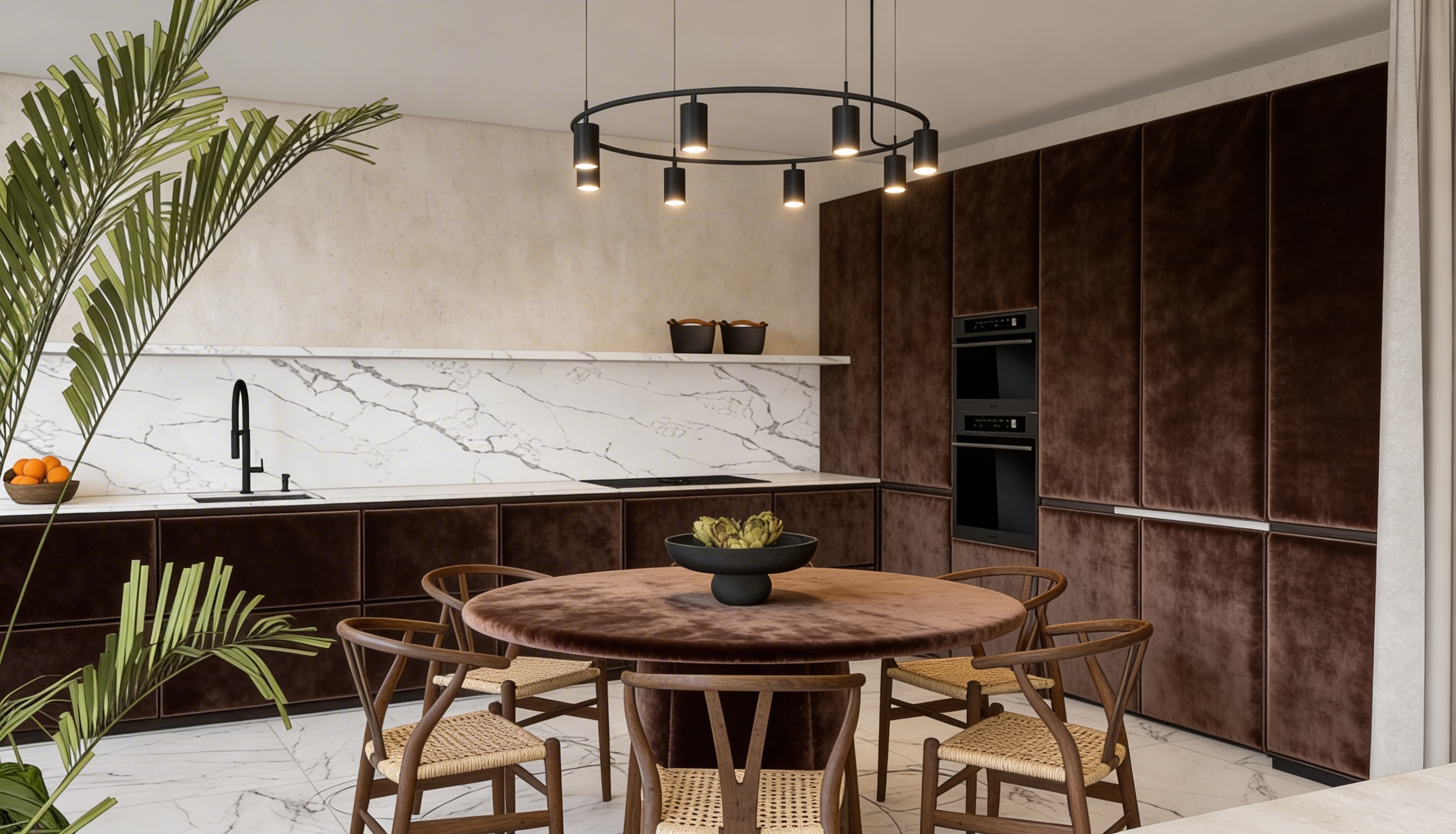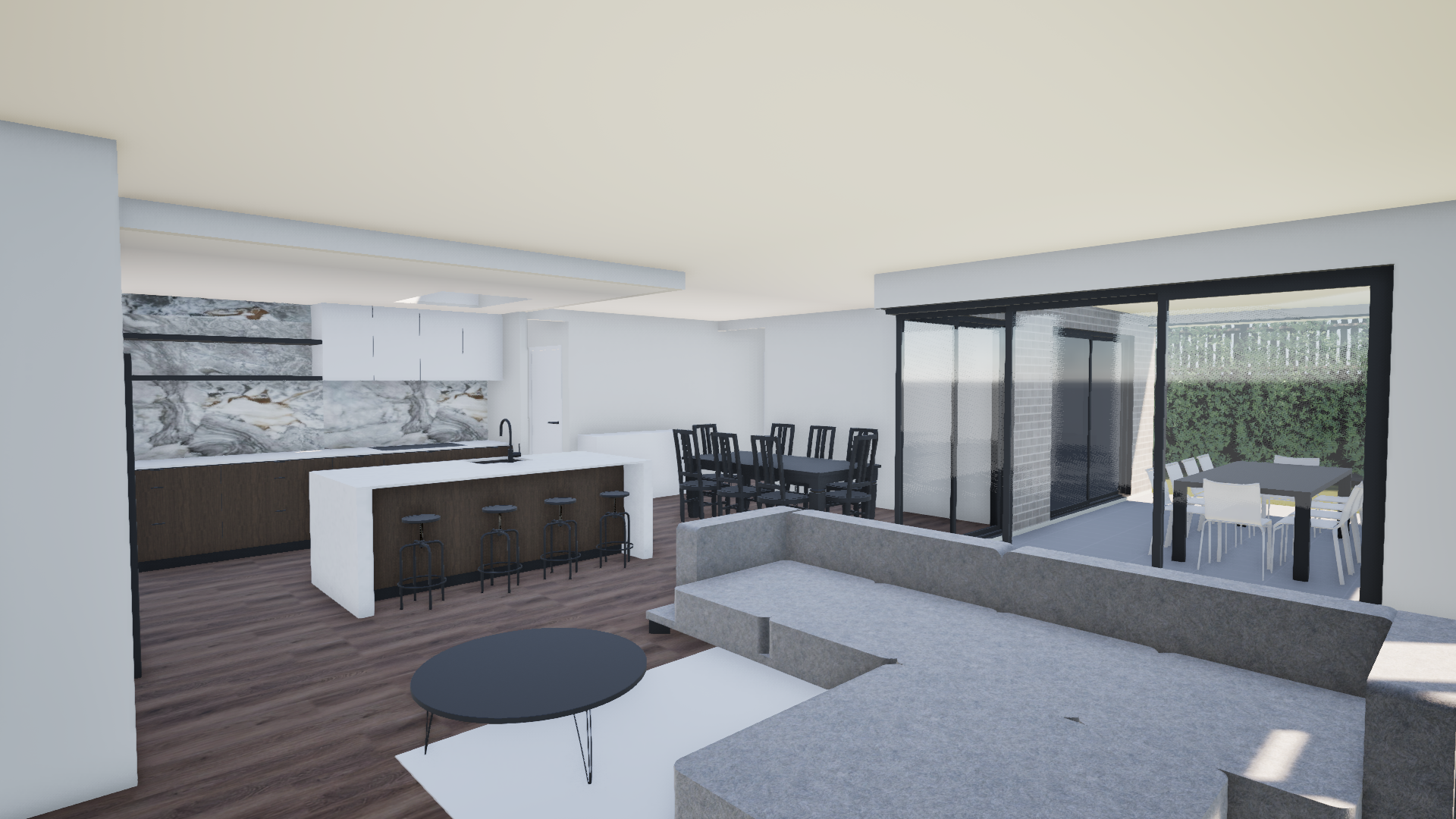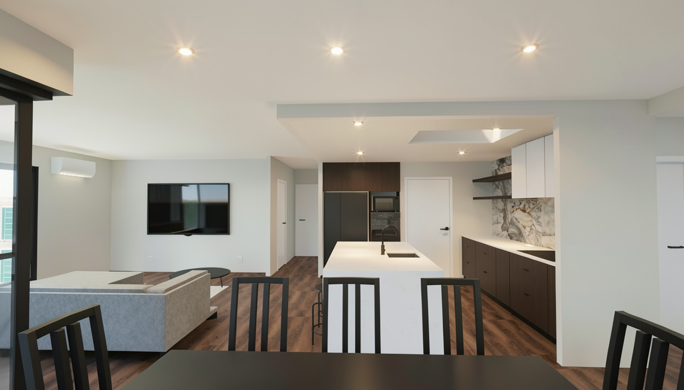 add downlights to ceiling and led strip light under kitchen island benchtop and overhead cupboards above splashback