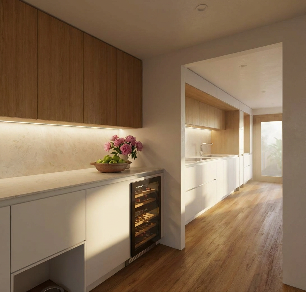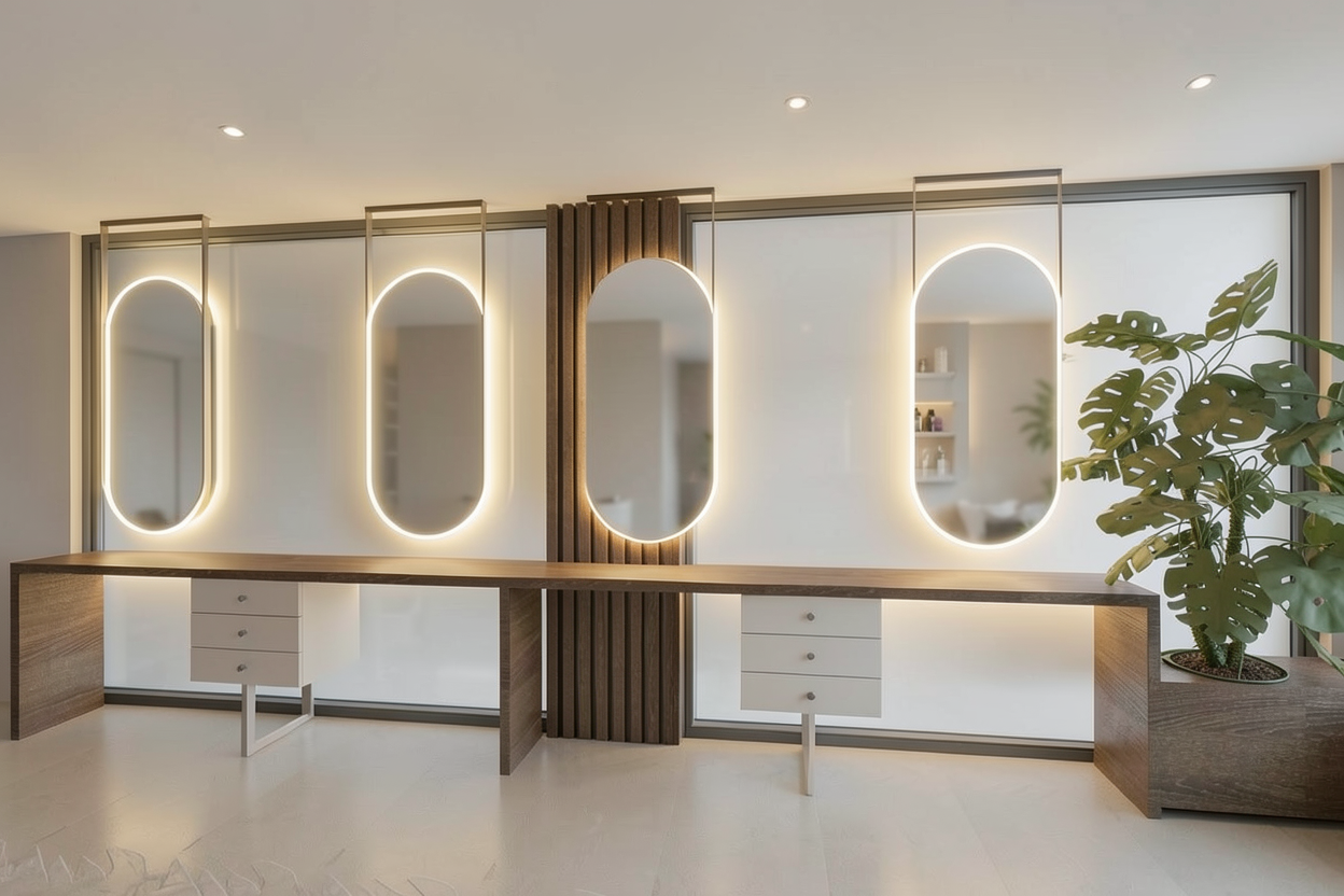 a minimalist hair salon station defined by clean geometry and a warm natural material palette a continuous wooden counter in dark oak finish spans the length of the wall creating a strong horizontal element below light toned drawer units with slim metal legs maintain a sense of lightness and functionality vertical suspended mirrors with elongated oval shapes are positioned rhythmically along the counter each mirror is framed with a thin matte black metal outline enhancing contrast and adding a subtle industrial touch integrated soft led lighting surrounds the mirrors producing a warm diffused glow the mirror surfaces are slightly blurred creating an abstract and artistic reflection rather than a sharp image this effect softens the visual experience and contributes to a calm relaxed atmosphere a central vertical wooden slatted panel adds texture and depth while large window openings allow natural light to flood the space reinforcing the feeling of freshness a touch of greenery completes the composition bringing balance and a natural serene character overall style minimal warm soft modern with subtle industrial accents