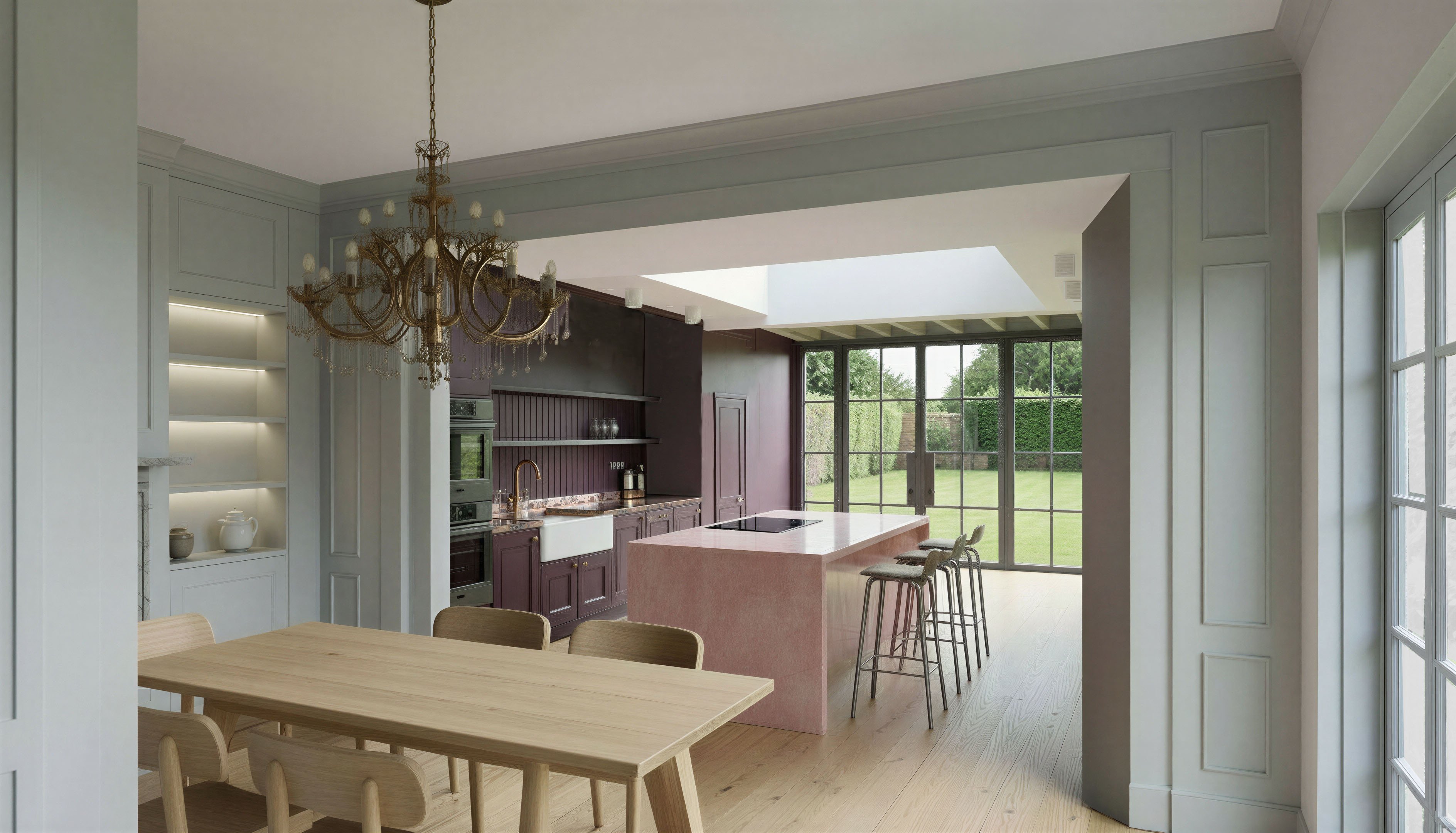 extend timber joists continuously below rooflight keeping the same colour direction and proportion as the ones in the original image