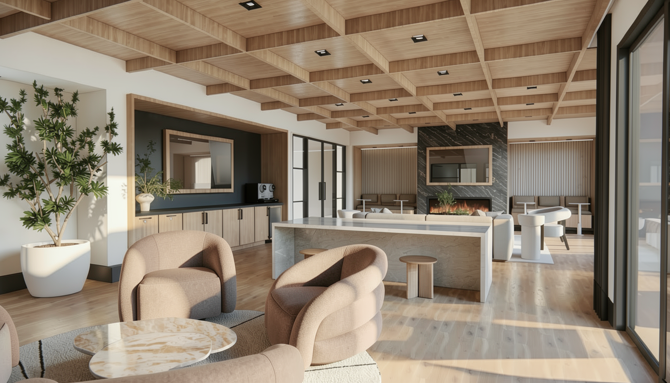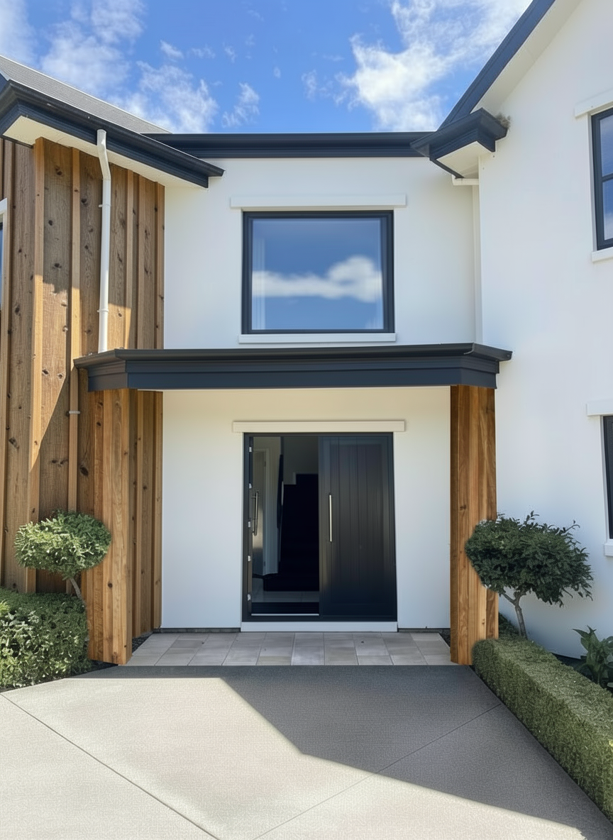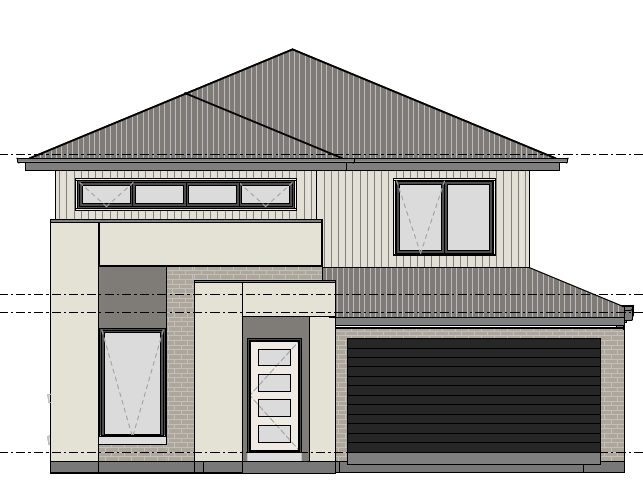 create photorealistic render with morning light suburban setting with grey tone timber fences to either side provide a 5m deep front yard with grass and garden beds with low level planting and 1 feature tree that does not obscure the house garage door is black colorbond front door is painted surfmist window frame colour is monumnet brick colour is praline by austral bricks