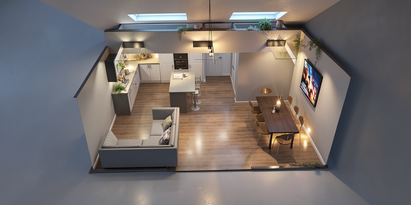 convert top down floor plan into realistic interior perspective