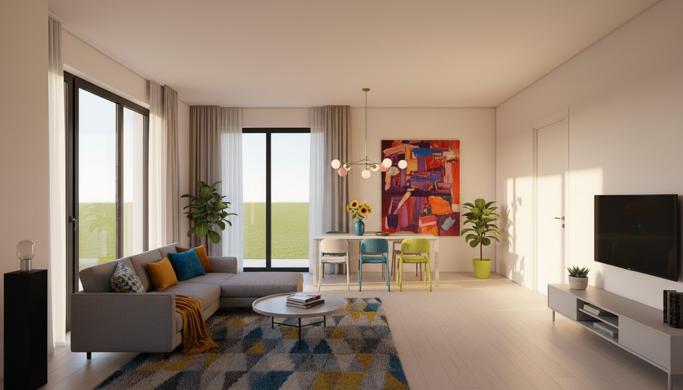 create an ultra photorealistic 3d render based on image 1 keep the exact same composition camera angle perspective and layout as image 1 do not change the position of any walls furniture or objects the spatial arrangement must remain identical enhance all materials to look highly realistic and physically accurate natural textures subtle imperfections correct reflections realistic light interaction detailed shadows use high quality pbr materials with realistic wood grain fabric texture metal reflections glass transparency and subtle wear details apply realistic lighting natural daylight or soft interior lighting with accurate global illumination and soft natural shadows adjustment add bar stools only on the left side of the composition the bar stools must match the existing design and use the same color palette as image 1 ensure the bar stools fit seamlessly into the space in terms of style and finish style color reference use the colors mood and stylistic qualities of image 2 as a reference for material finishing contrast light temperature and overall atmosphere the final result should feel modern refined and architecturally realistic quality requirements 4k resolution very high level of detail fully photorealistic not stylized subtle depth of field no distortion or artistic filters
