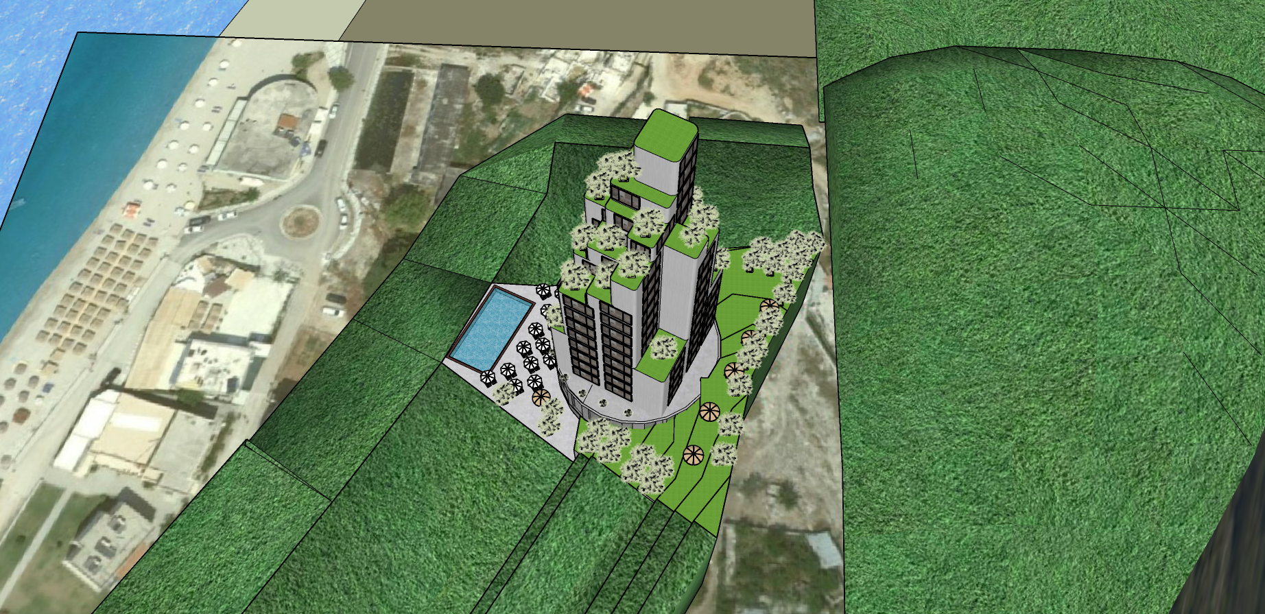 towering modern skyscraper amidst lush green hills with a complex structure made light grey concrete walls the building sports a unique geometric design with terraces adorned with greenery the surrounding hills are a vibrant green providing a serene backdrop a crystal clear pool reflects the bright blue sky earthy tones are present in the scattered trees and the subtle pathways atmosphere is peaceful and harmonious conveying a sense of futuristic urban living blended with nature please fill the surrounding hills with olive trees and some houses make it an elite residential zone