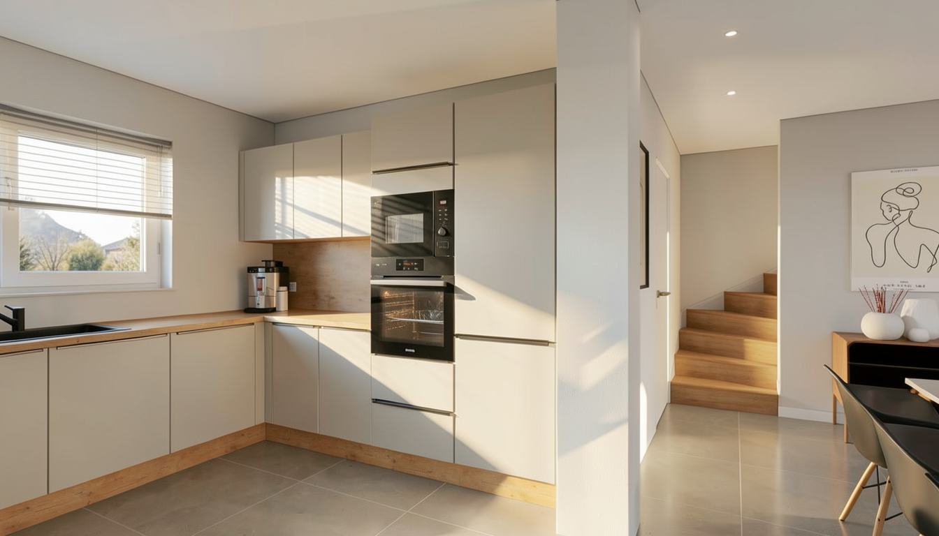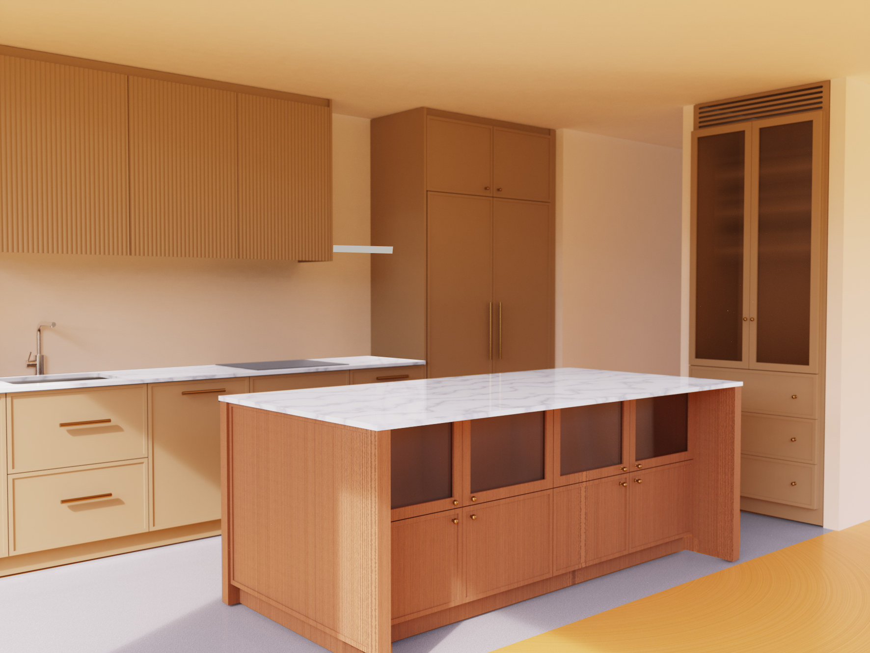taupe painted kitchen with with marble splash back rich walnut island with reeded glass doors at top