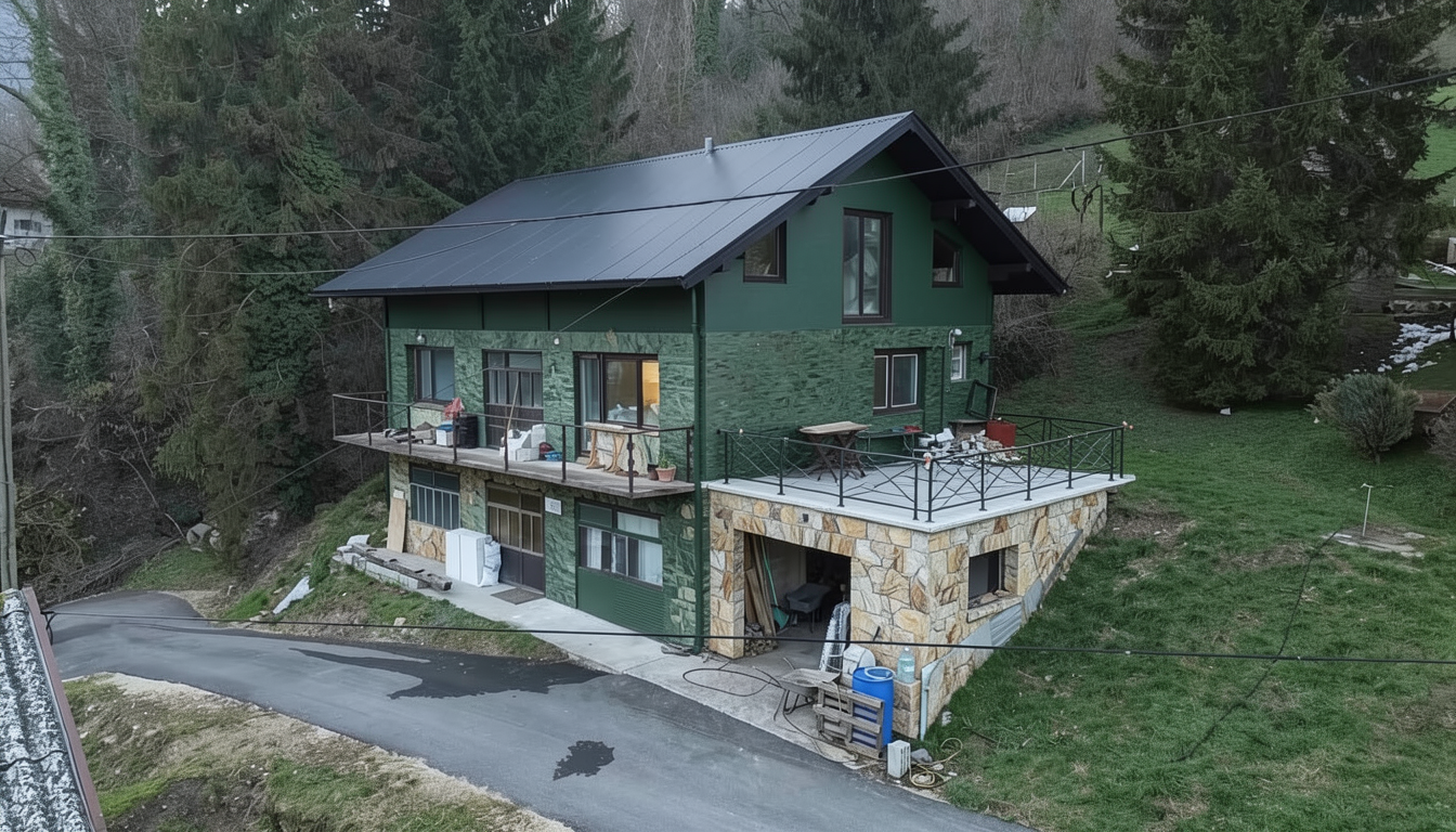 ground floor facade is in grey stone marble color and first floor facade is in dark green color roof is in anthracite black color garage is in stone marble color on the garage roof there is metal railing with small beams remove every furniture