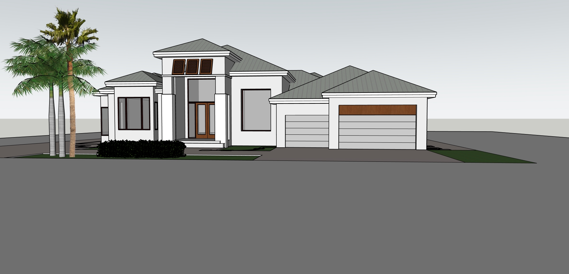 a florida modern house facade with a tropical ambiance create a realistic rendering of a contemporary house featuring a light gray exterior with shades of darker gray for the roof incorporate large windows with sleek bronze frames keep original window frames the front door should have warm wood tones the garage door is gray and there is a wood accent above it add lush green palm trees and bushes in the front yard with vibrant grass the sky is clear with a subtle gradient from light blue to soft white the overall atmosphere is tranquil and inviting bathed in soft natural sunlight the shutters above the front entrance are bahams style keep geometry