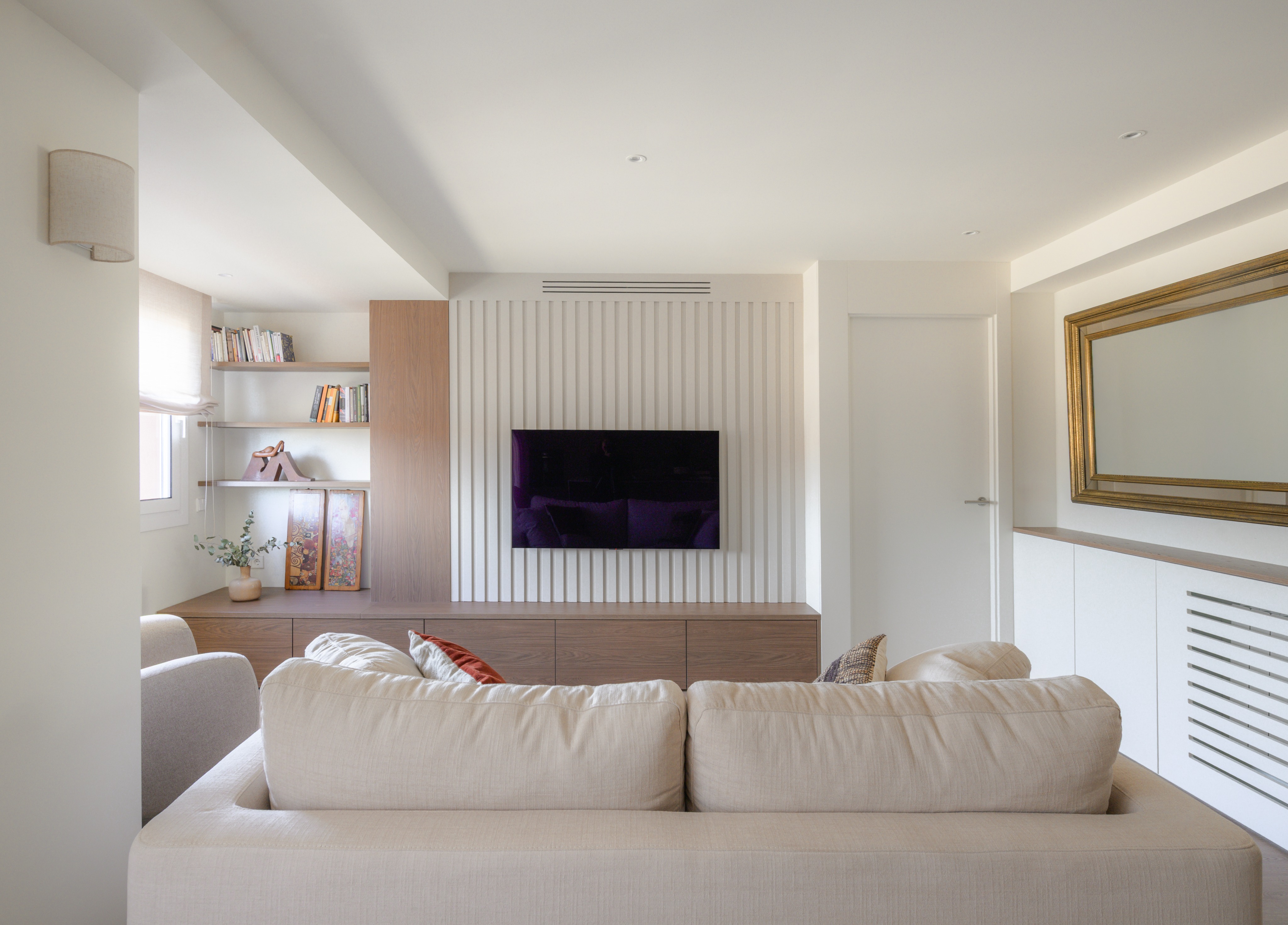 replace the mirror on the right side for a minimal mirror with a wood frame