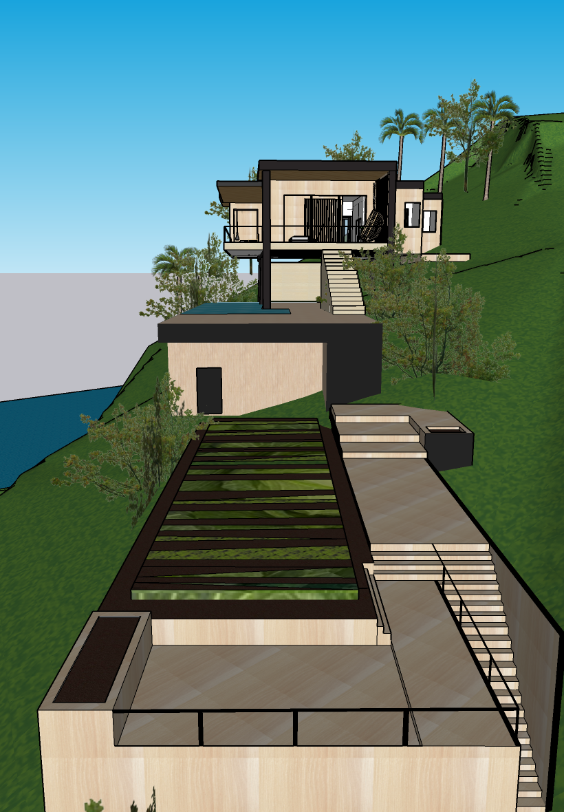 exterior shot render a modern hillside house with terraces clean lines and minimalist design use light beige for the walls and dark gray for the accents set the scene on a lush vibrant green hillside beside a calm blue ocean the lowest terrace features a full vegetable patch middle terrace contains an infinity pool and decking with steps leading to the main house incorporate realistic trees with rich green foliage and introduce palm trees to add a tropical feel the sky is clear and bright a serene daytime atmosphere with an inviting and tranquil mood