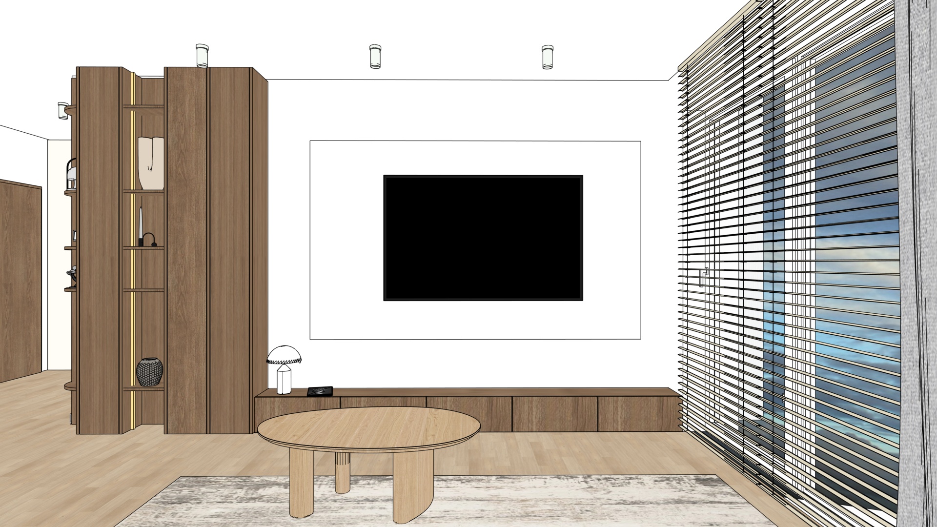 illumination in the interior as on a cloudy day transform the input interior design photo into a hyper realistic architectural visualization of a contemporary modern interior preserve exact geometry layout proportions and material intent from the original design lighting create soft overcast daylight atmosphere similar to a cloudy rainy day without visible rain with diffused natural light entering through windows add warm artificial lighting from all lamps accent led backlighting behind the tv subtle ambient glow to enhance depth and spatial layering maintain balanced contrast no harsh shadows no overexposure materials textures enhance material realism micro details surface imperfections soft reflections accurate roughness physically correct light response emphasize textures wood grain fabric weave stone concrete metal and matte finishes high micro contrast and tactile depth rendering style ultra photorealistic architectural visualization cinematic quality natural color grading neutral tones soft highlights realistic global illumination physically based rendering high dynamic range premium interior photography style camera composition wide angle architectural lens natural perspective eye level viewpoint deep focus sharp details across the frame natural framing no distortion atmosphere calm elegant contemporary premium residential mood clean minimal refined without visual noise output 8k resolution ultra detailed noise free crisp edges professional architectural rendering quality negative prompts no rain droplets no lens flares no fog no haze no bloom no motion blur no cartoon no stylization no oversharpening no artificial glow no unrealistic reflections no distortion no clutter