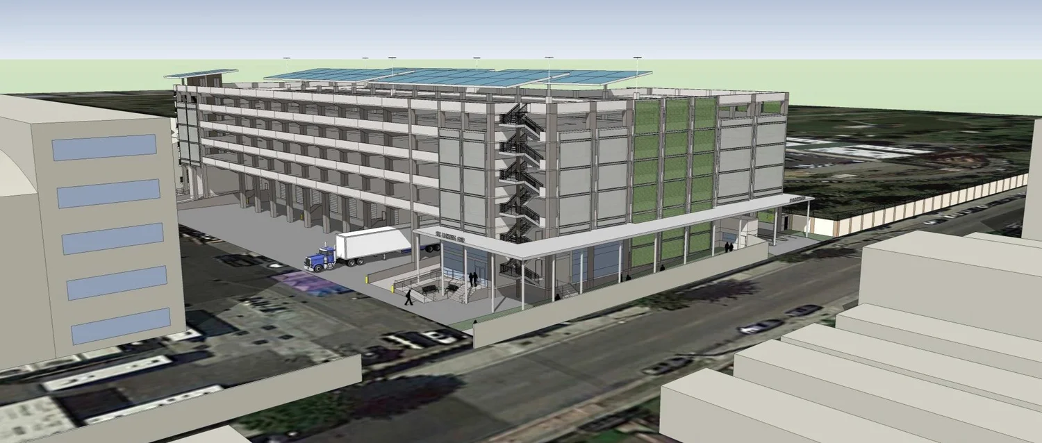 parking structure with concrete panels the middle panels that face the street frontage show climbing vines