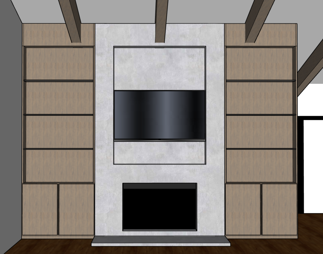 exterior shot add fire in the fireplace show glass shelves and add under light shelving
