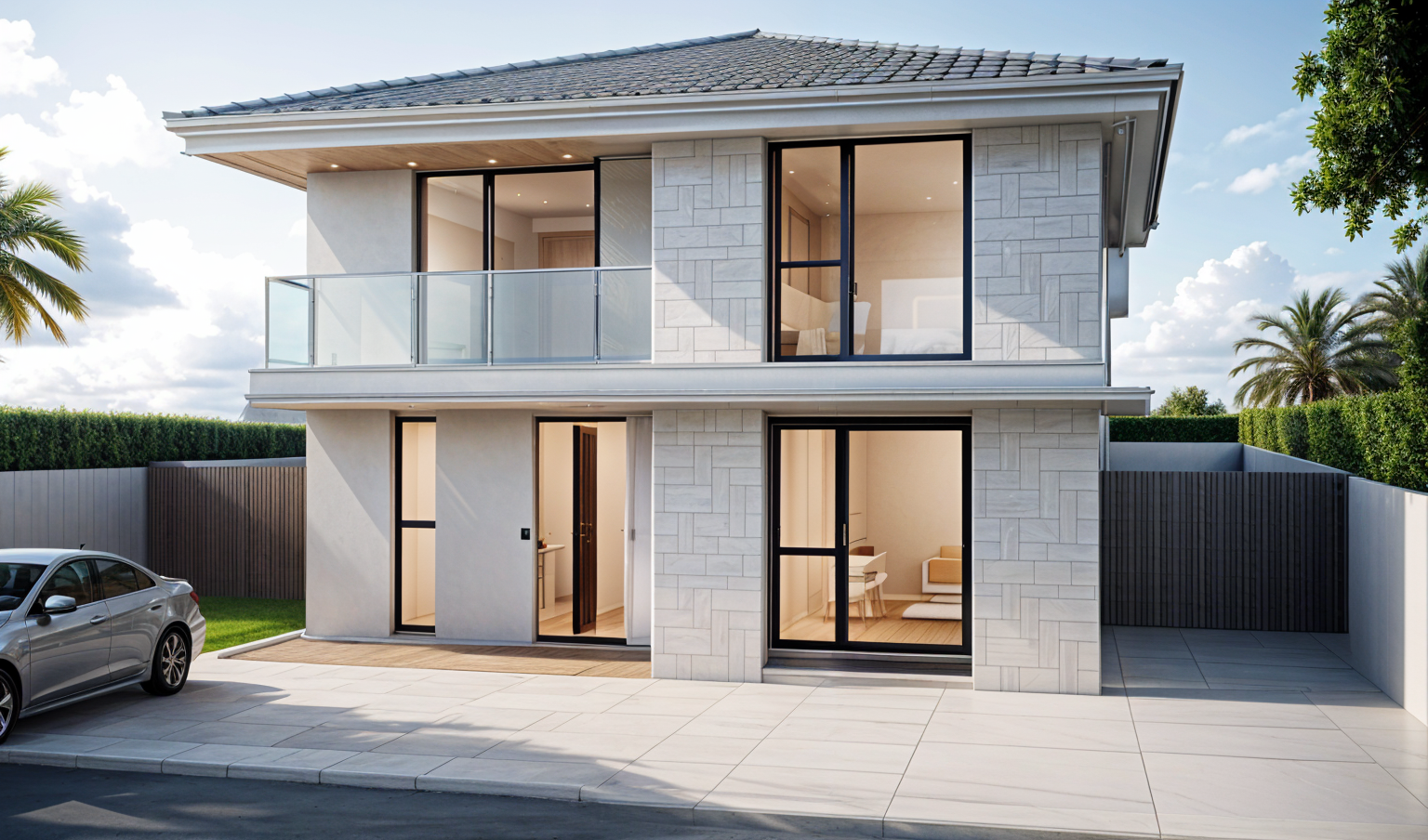 a manicured lawn layered flower beds low maintenance shrubs native plants stone pathway leading to the entrance