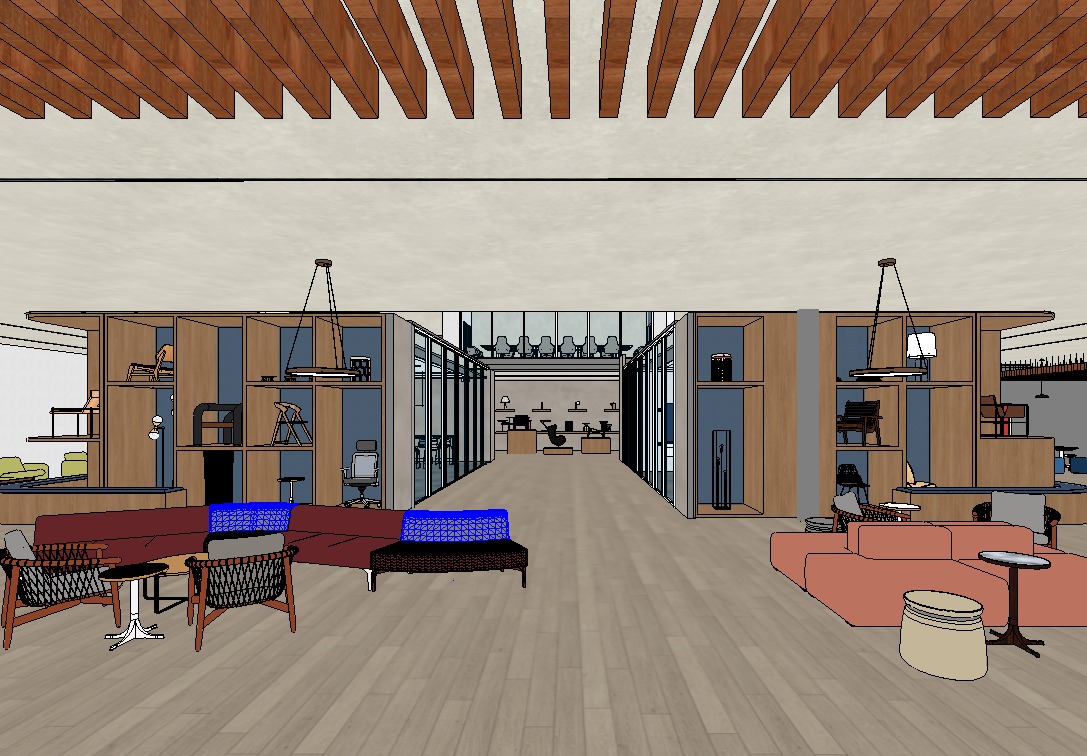 photorealistic architectural interior rendering of the exact same central millerknoll showroom lounge shown in the reference image preserve the camera angle symmetry perspective circulation axis architecture built in millwork portals central glazed corridor furniture layout shelving composition ceiling design and all proportions exactly as modeled do not redesign reinterpret or restage the space main design intent high end contemporary millerknoll showroom interior warm sophisticated curated gallery like and highly architectural the space must feel like a premium design showroom with layered lounge settings and display vignettes ceiling preserve the ceiling exactly as shown the foreground ceiling feature is composed of warm wood linear slats acoustic baffles with clean spacing and strong rhythm keep the exact direction density spacing depth and alignment of the wood slats the rest of the ceiling remains smooth painted gypsum board drywall in a soft matte off white finish do not replace the wood slats with generic panels do not add extra ceiling features architecture and millwork preserve the exact symmetrical freestanding millwork pavilions display portals on both sides of the central corridor these wood structures must remain in warm natural oak or walnut oak veneer with subtle grain and matte finish maintain all shelving openings vertical divisions display niches and framing proportions exactly as modeled preserve the full height glazed corridor meeting room frontage in the center with slim dark frames keep the spatial layering and the long visual axis exactly the same furniture preserve all furniture locations and compositions exactly as shown keep the lounge groupings in the foreground and side zones with the same layout and scale furniture should read as premium millerknoll showroom pieces sculptural sofas lounge chairs woven or upholstered seating side tables and curated accessories maintain the different upholstery tones already implied in the model but elevate them with luxurious refined materials do not replace the arrangement with generic furniture do not overcrowd the scene materials and finishes flooring should be light natural oak or light wood plank flooring with subtle grain and matte finish wood millwork and ceiling slats should be warm natural oak walnut oak tone elegant and not overly orange walls should remain soft light greige warm off white with refined matte texture central glazing frames should be dark bronze or matte black slim and minimal furniture finishes should feel premium boucle wool leather woven cord matte metal and refined wood accents lighting use soft architectural ambient lighting with balanced daylight keep the suspended decorative fixtures exactly where shown light temperature should feel warm neutral around 3000k the space should feel bright calm and elegant not dramatic or overlit no colored lighting no extra fixtures no dramatic spotlights atmosphere luxury contemporary design showroom editorial minimal curated sophisticated and warm clean negative space strong materiality and refined visual balance rendering quality ultra photorealistic portfolio quality interior visualization crisp architectural lines realistic wood grain subtle reflections soft shadows balanced exposure and believable daylight high end editorial showroom atmosphere important restrictions do not change the camera angle do not alter the symmetry do not modify the ceiling slat layout do not change the millwork pavilion geometry do not move the furniture do not redesign the central glazed corridor do not add people plants signage or clutter keep everything exactly as in the model only render it realistically and beautifully