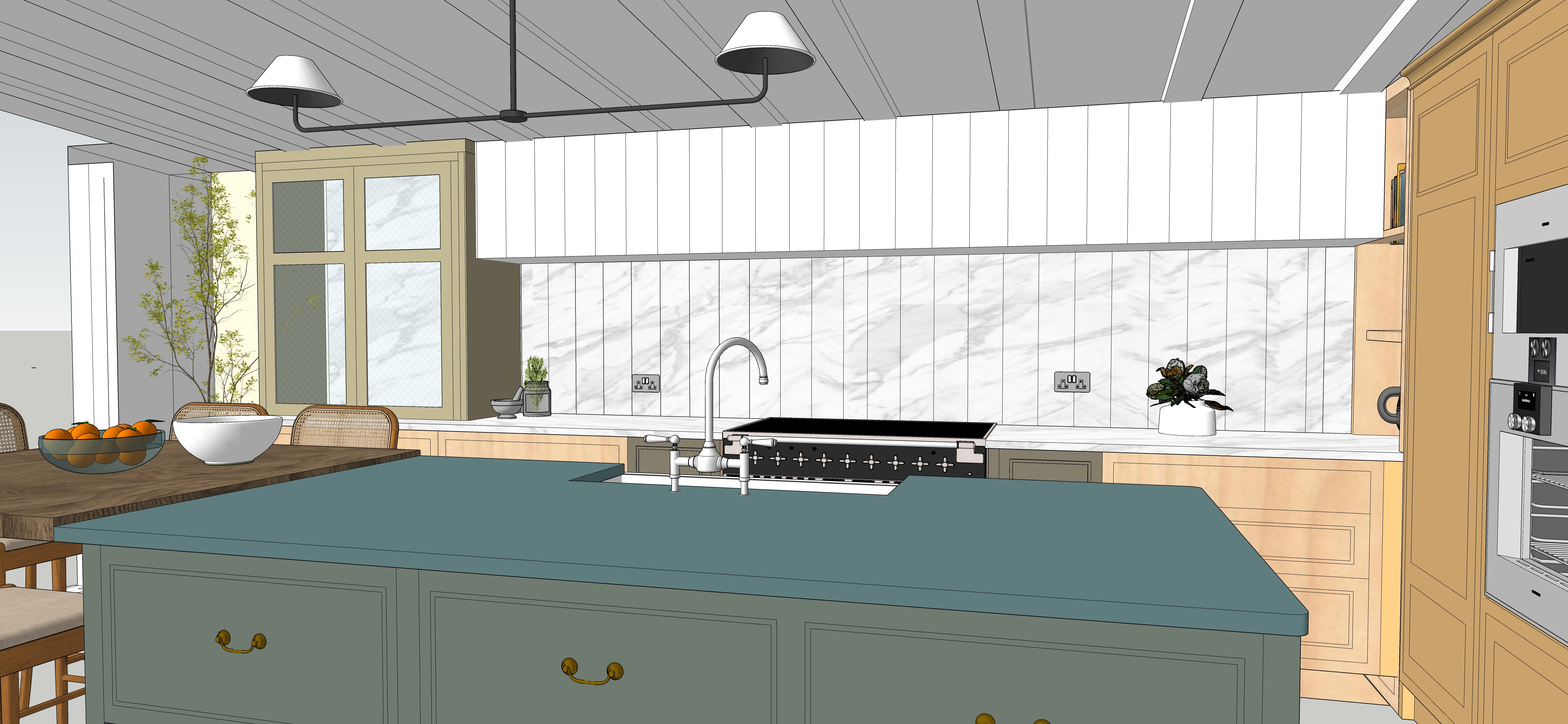 render this image with this materials shown in image add natural daylight add shelves to mid height cabinet with glassware add lighting under wall cabinets make island worktop lavastone