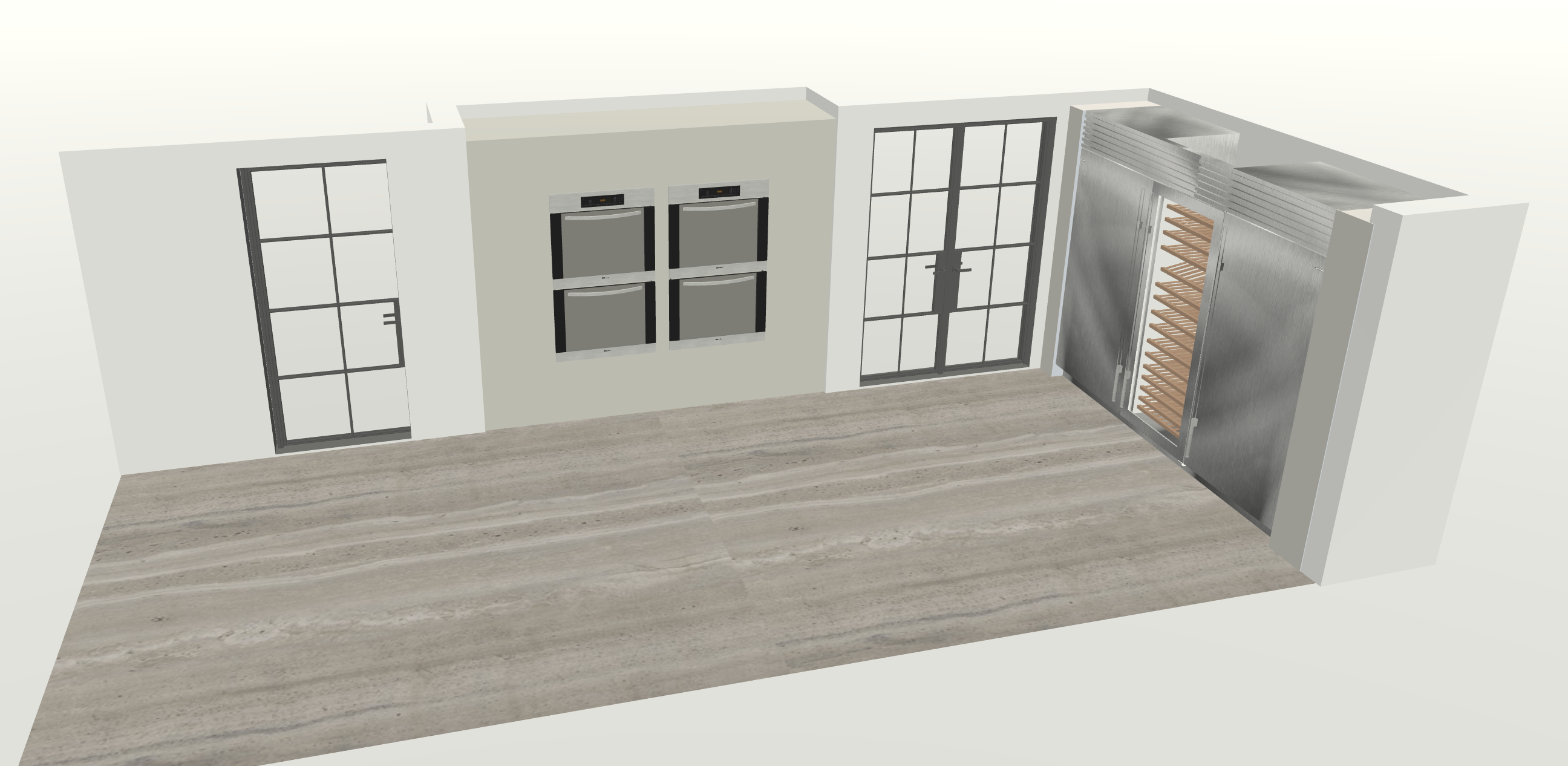 re draw this section of open plan kitchen showing unit with two set of double miele ovens within units tall cupboards left and right of the whole unit single crittal door to the left and double crittal door to the right on the right side return subzero fridge wine fridge and freezer large unit