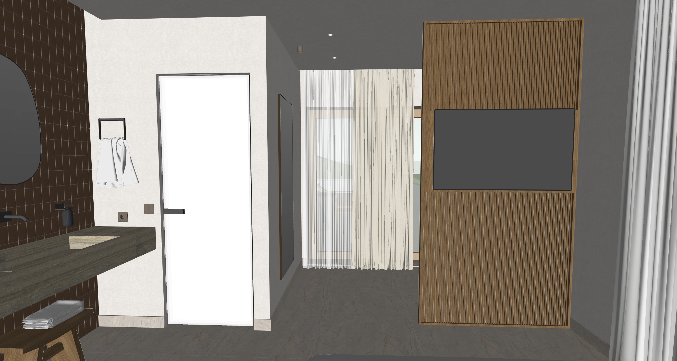 keep geometry the same make materials more realistic make lighting more realistic furniture has a warm walnut seamless oak wood texture wall and ceiling has beige texture the bench on the left side is made of gray beige travertine add led lighting below bench and the on the ceiling above the door has black frame and sunblasted glass pot is gun metal color