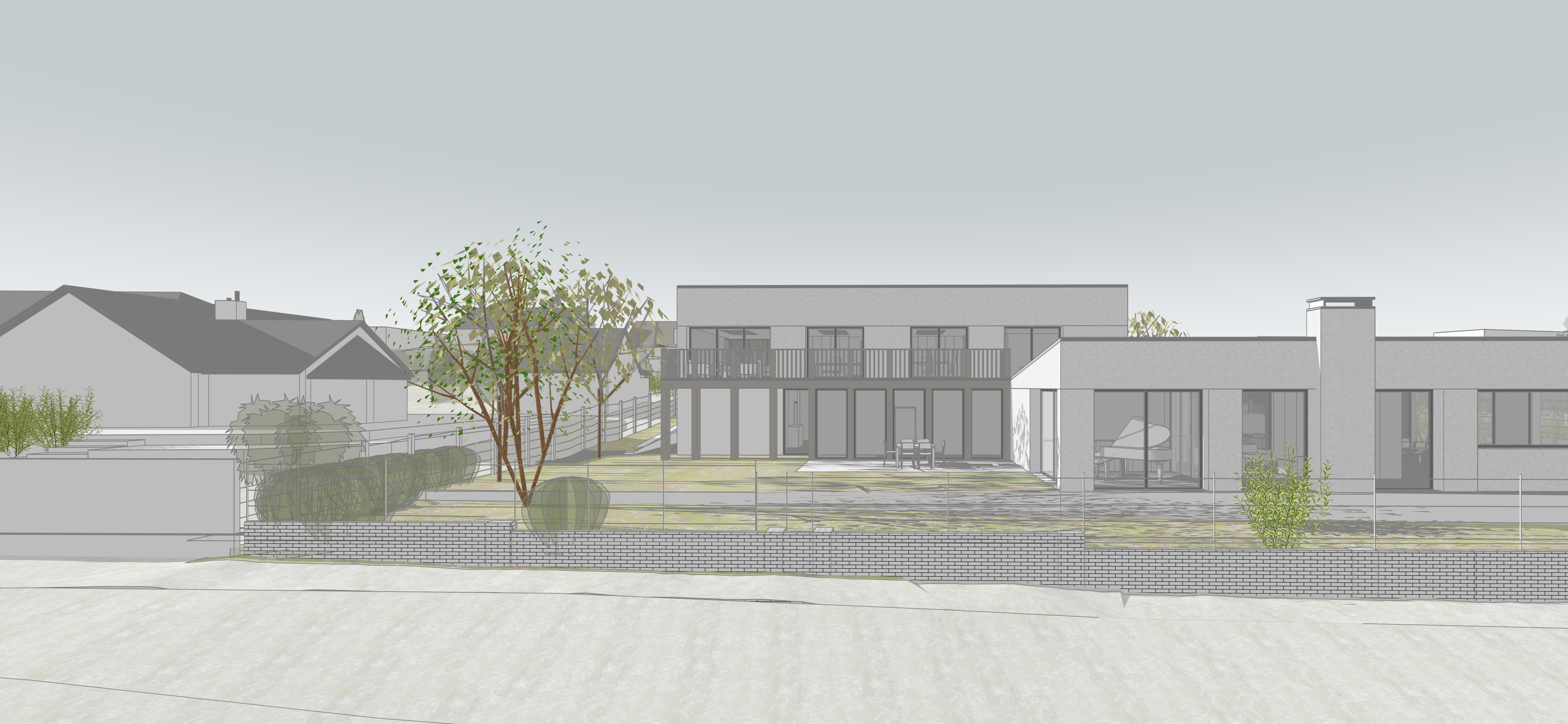 exterior shot increase the contast add a subtle texture across the image add some water colour textures across solid colours add some sketchy trees remove existing trees reduce saturation a bit make lines sketchy pencil emphasise the shadows and add a subtle blue to the sky with soft clouds architecture