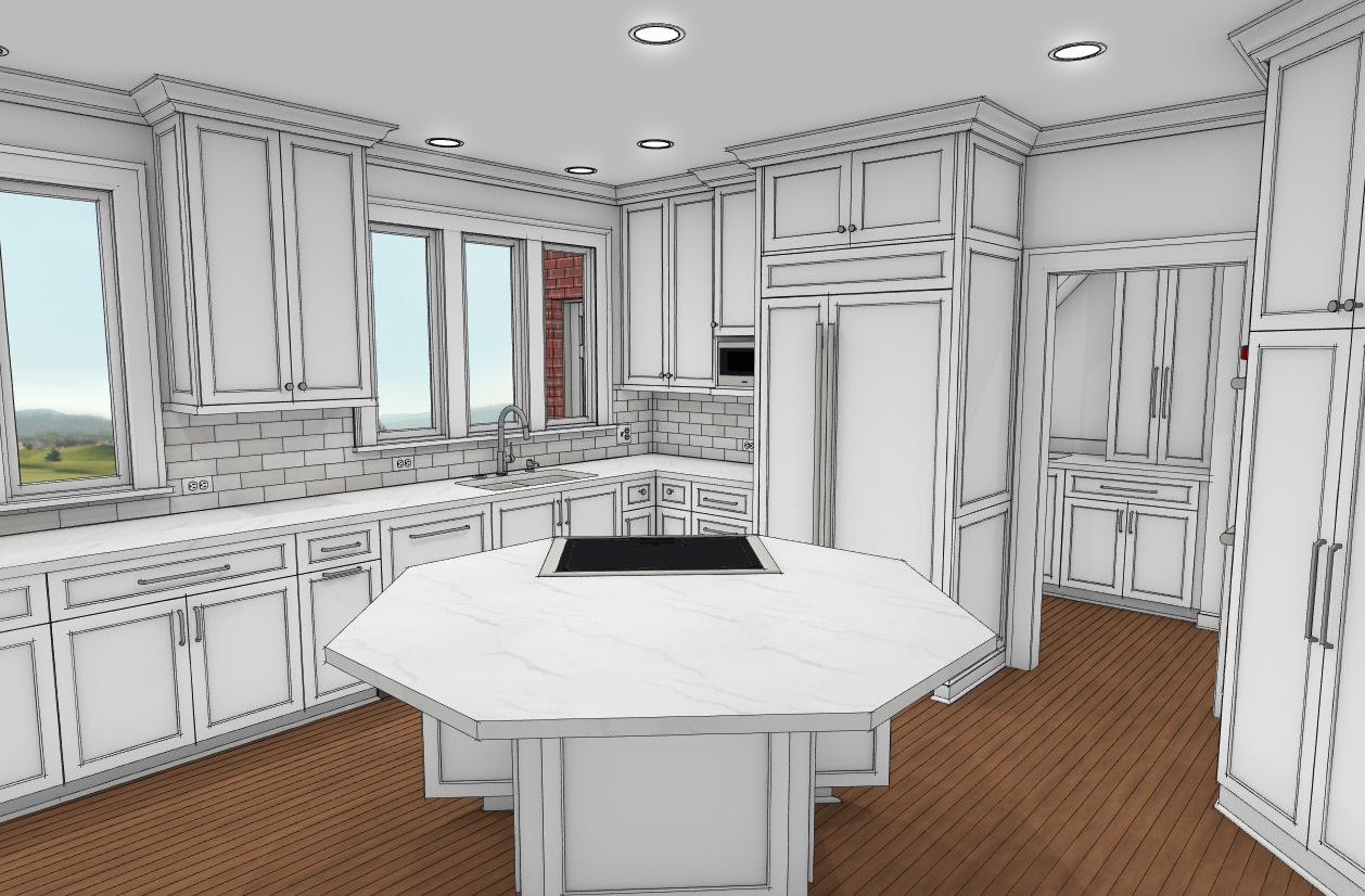 warm white kitchen with matte gold hardware medium stained hardwood flooring stools around island populate kitchen with typical cooking items and food daylight through windows and undercabinet lights turned on