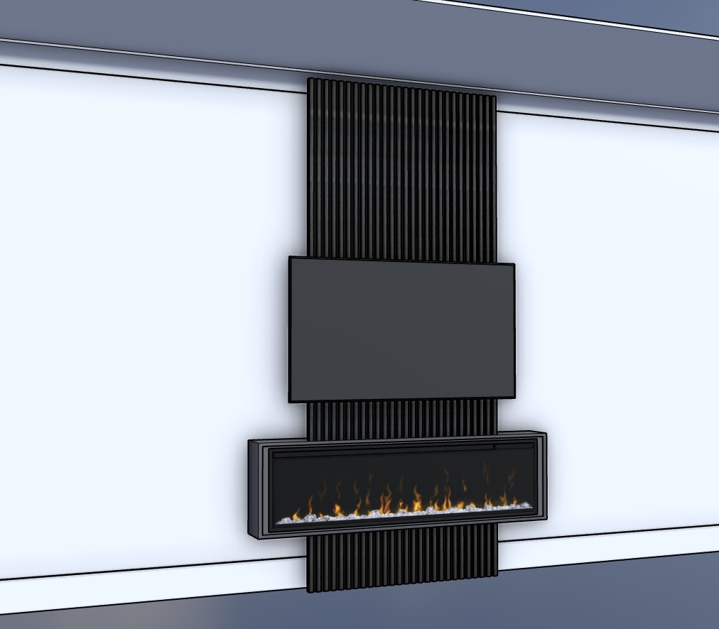 the image is of a faux chimney made from acoustic panels it is floating 100mm from the wall and built into it is an electric fire and a 60 tv