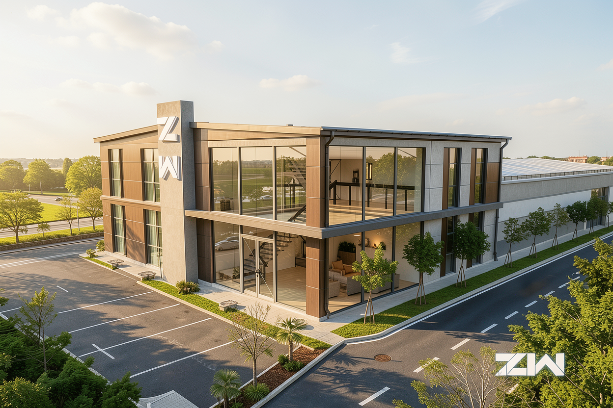 industrial building facade from reflective corrugated aluminum cladding field with lots of flowers and high grass in front orange sky at dusk hyperrealistic