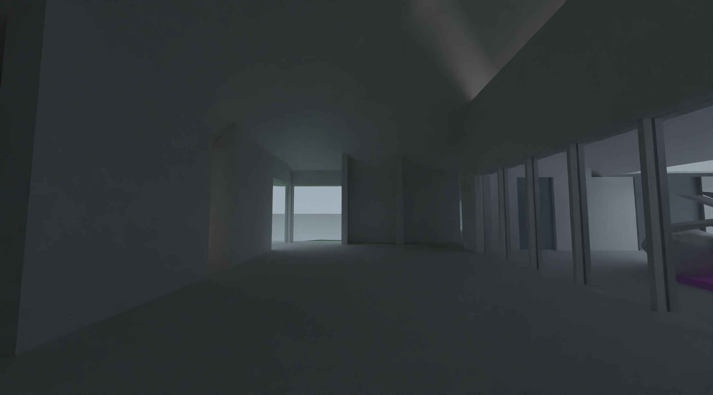 extremely large double height living hall monumental architectural interior 20 foot ceiling height expansive white sculptural ceiling surface flowing across the space continuous warm hardwood flooring minimal walls pushed far apart furniture scaled small relative to architecture lagoon concept expressed subtly through translucent glass lighting and reflective materials no clutter very few objects vast empty floor area soft even daylight camera placed at human eye level but far from furniture ultra wide architectural rendering emphasizing volume and scale