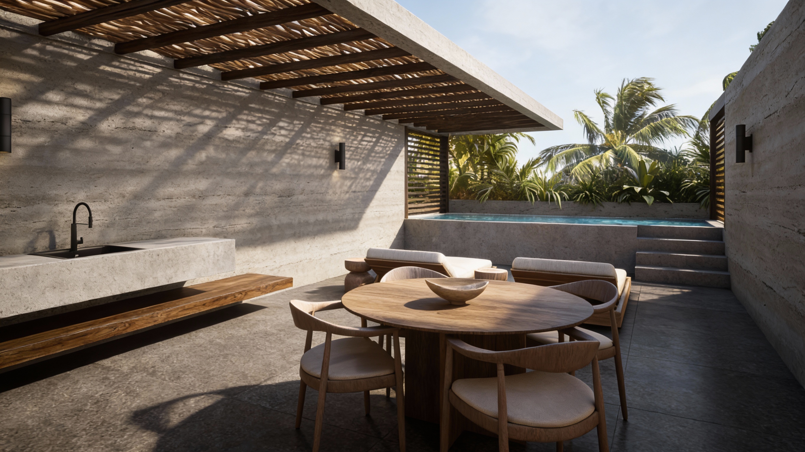 do not change the view only enhance the current materials and make the landscape nicer vegetation glass reflections in the windows and a vibrant clear sky with light atmospheric depth render in hyper realistic architectural visualization quality 8k resolution render a photorealistic 3d perspective of this house in a snowmass co reference the current material style just enhance them brown standing seam metal roof vertical oak brown wood siding colorado buff rough limestone where shown keep model geometry the same windows doors roof walls garage door pavement driveway make a lush vegetation that looks native to snowmass co