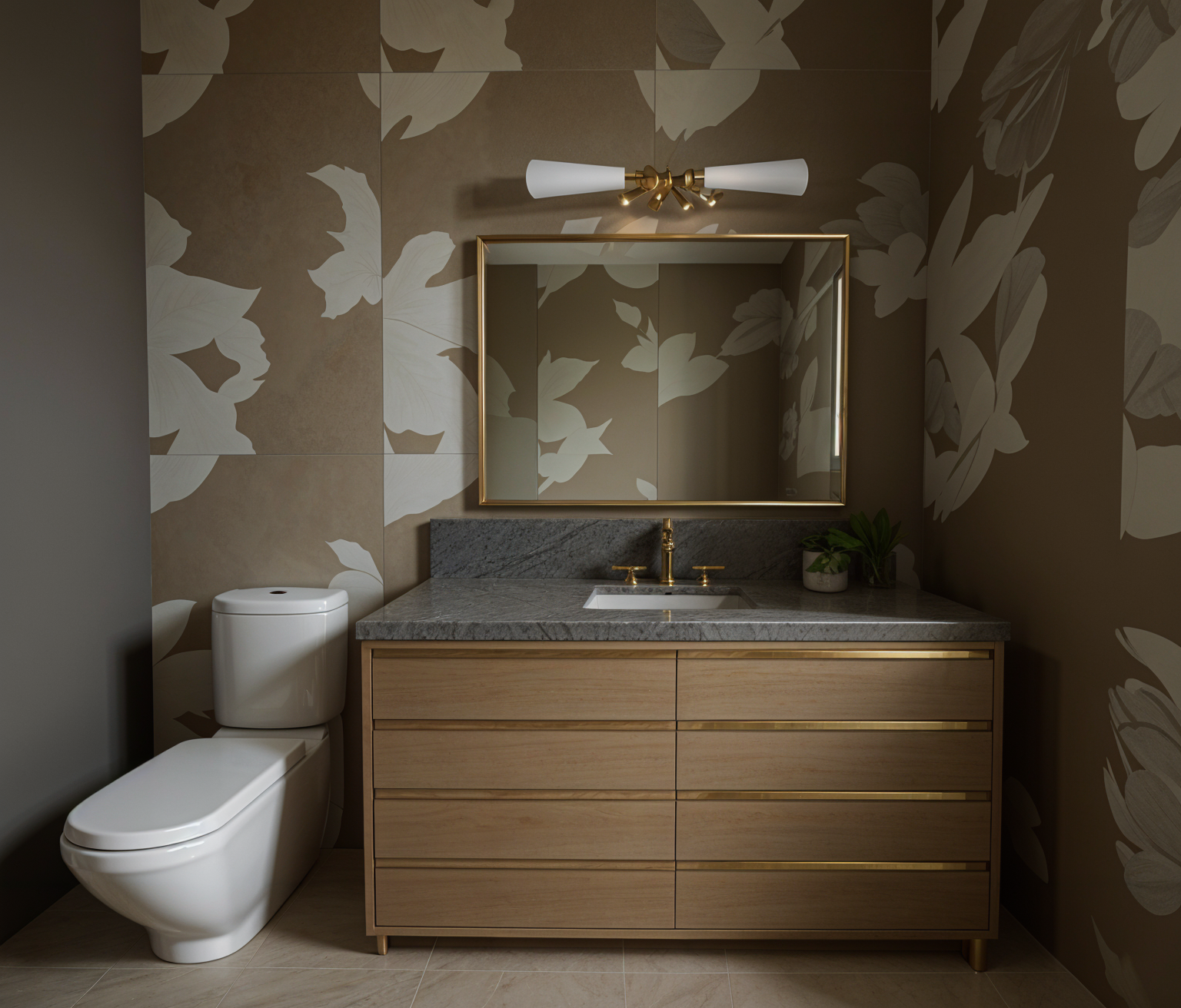 a modern two story house with a symmetrical facade featuring large black framed windows and a light beige exterior the building materials are a mix of smooth stone and horizontal wood paneling the entrance showcases a sleek black double door with minimalistic lighting the front yard is well maintained with vivid green grass and small ornamental plants tree lined surroundings with lush green foliage create a serene suburban atmosphere the sky is a clear soft blue with wispy clouds adding to the peaceful and inviting ambiance