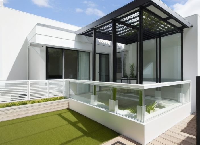 modernist exterior shot render a modern outdoor terrace with sleek minimalist design the floor is made of warm rich mahogany wood and the railings are transparent glass with a subtle metallic framework in brushed steel the overhead structure features intricate geometric patterns in matte black the walls are a crisp clean white contrasting beautifully with the dark elements the windows are tinted in a soft gray reflecting a serene sky slightly overcast with gentle sunlight the atmosphere is calm and inviting capturing the essence of sophisticated modern architecture it is a view from the second floor architecture