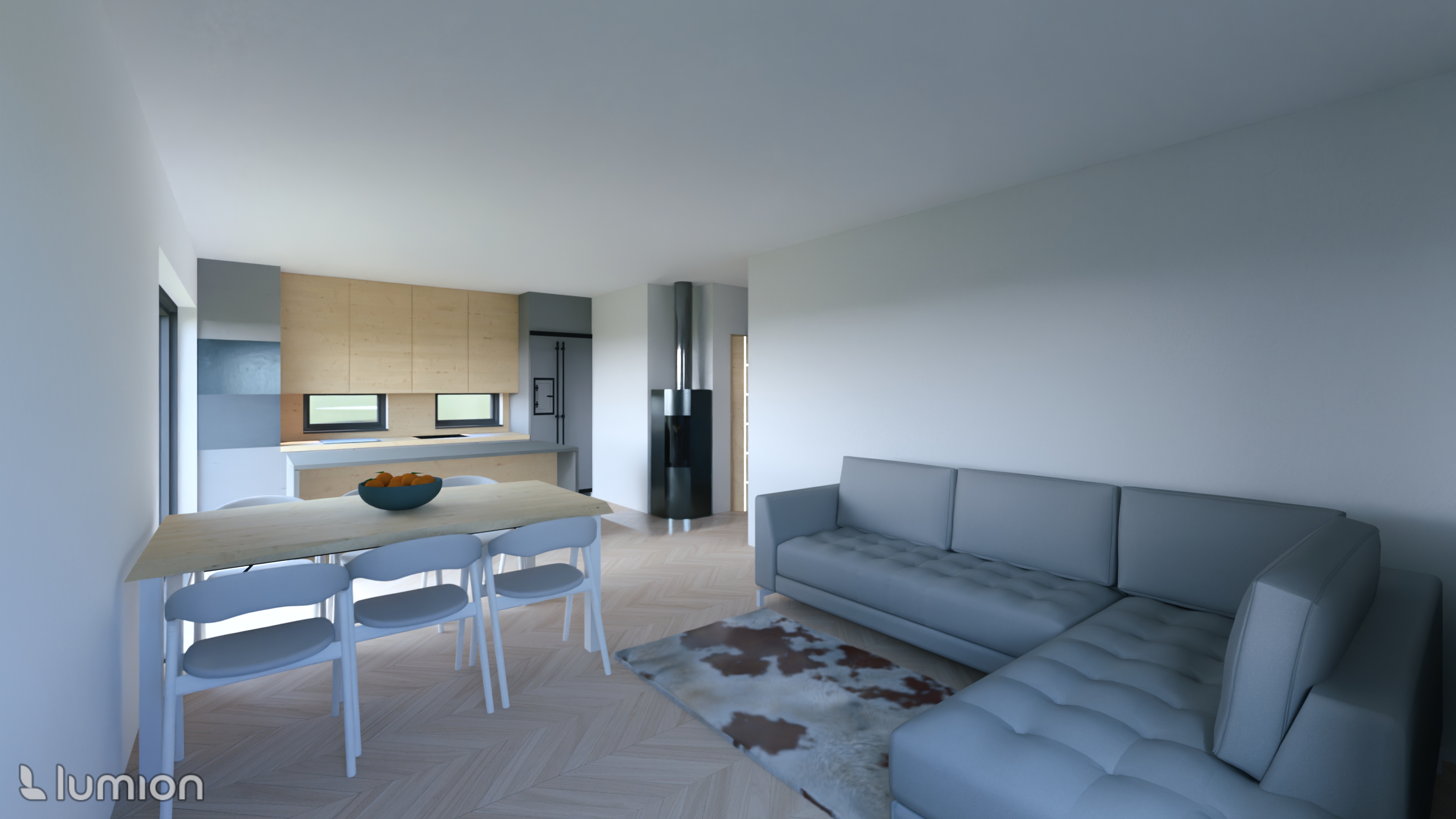 make the visualization as realistic as possible add home accessories a fire in the fireplace add ovens with a microwave to the left kitchen corner and put led strip lighting above the table and kitchen island