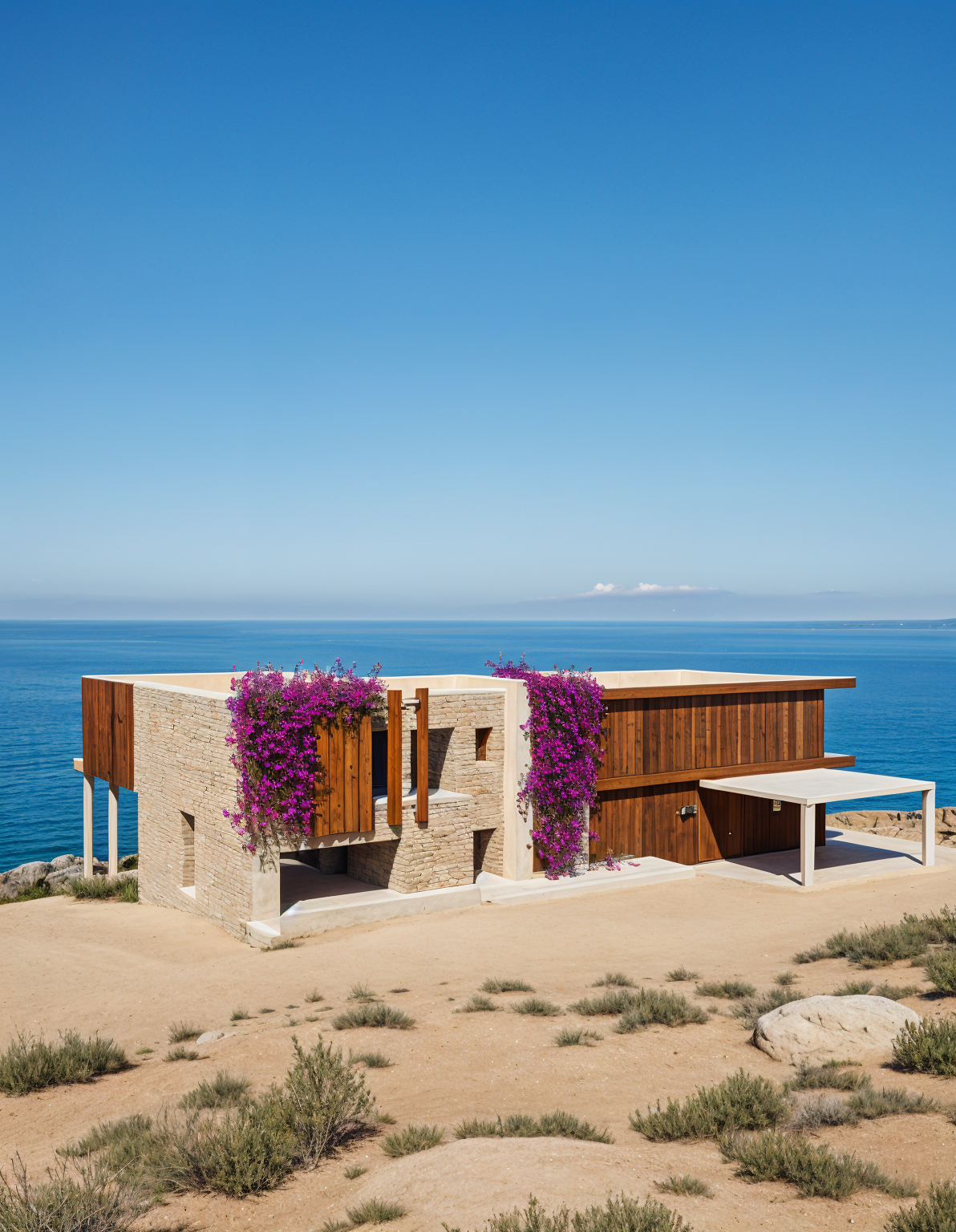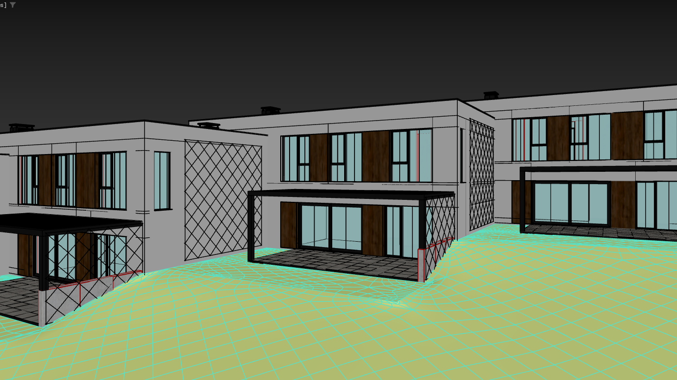 exterior shot exterior shot daylight environment make white material white stucco facade make grey material dark grey stucco add greenery add exterior furniture add interior add some curtains add some people