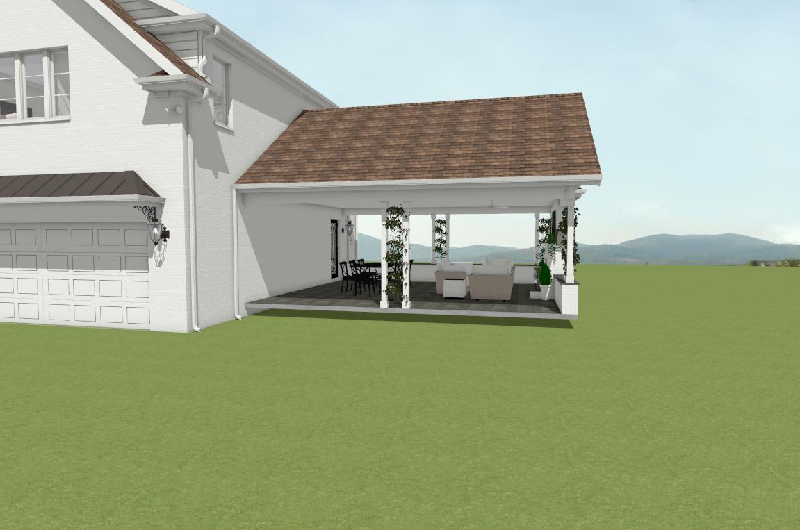 add daylighting add minor suburban landscaping the exterior is white brick with ceramic shingles copper gutters and downspouts add paver walk way in front of the covered patio add bushes to the left and trees to the right