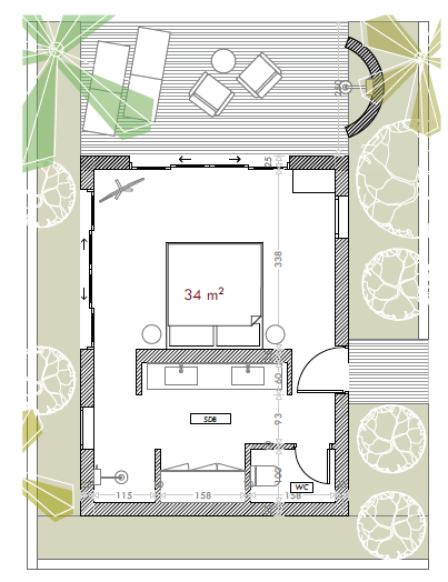 convert this floor plan into a realistic isometric 3d view of a full house show the space from an elevated angle with furniture walls and details visible luxury marrakech riad 1001 nights heritage 5 star grand luxe warm intimate cinematic lighting 2700k handcrafted moroccan details refined not kitsch materials hand applied tadelakt walls in warm sand beige zellige accents subtle brushed brass lanterns and hardware dark walnut cedar wood natural stone travertine floors woven textures decor moorish arches carved or filigree brass elements artisanal pottery handwoven rugs layered textiles linen velvet embroidery color palette sand ivory warm beige touches of brass gold optional accents indigo saffron or emerald mood quiet luxury boutique palace marrakech heritage premium craftsmanship uncluttered styling use the same furniture as shows on the plan do not change the orientation of the floorplan