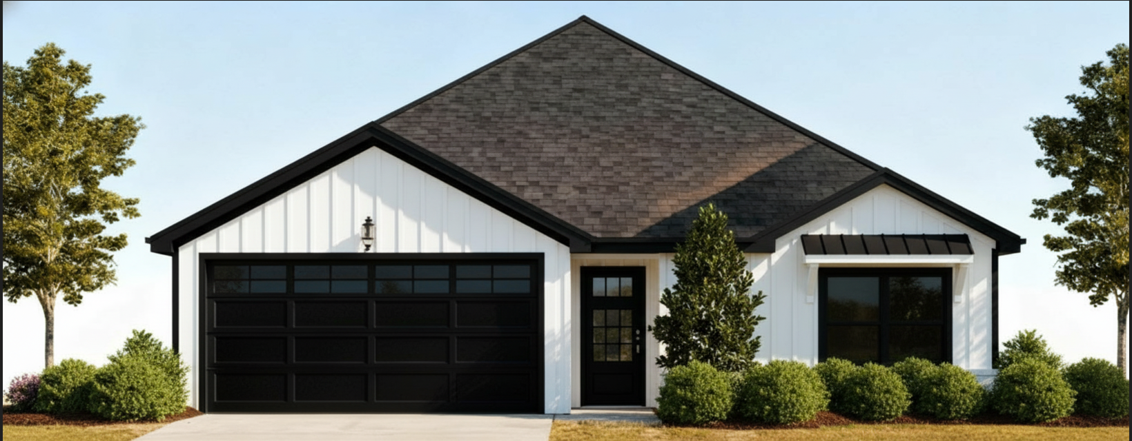change the siding color to white trim to black garage door to black front door to black windows to black