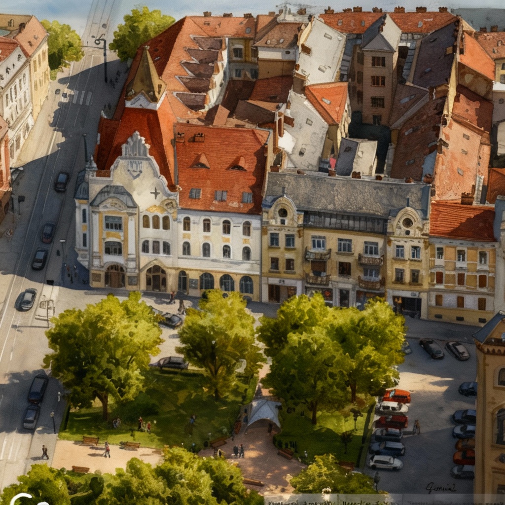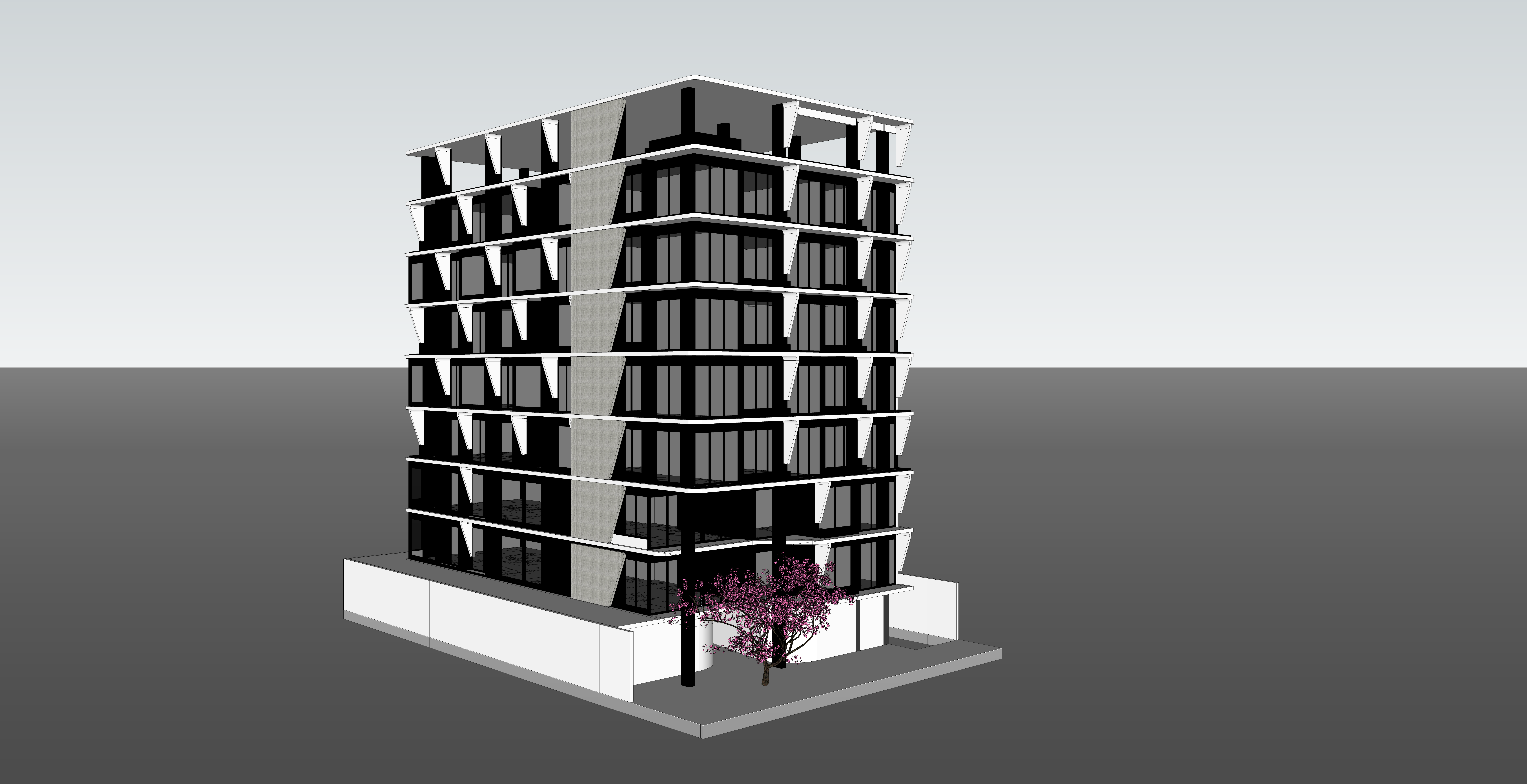 exterior shot modern seven story building with a sleek contemporary design featuring bold geometric shapes the facade is composed of contrasting black and white panels with large glass windows adding elegance and transparency add a touch of natural beauty with a single cherry blossom tree in the foreground its delicate pink flowers providing a vibrant pop of color the atmosphere is serene and sophisticated set against a soft light gray sky that enhances the building s dramatic angles the scene should convey a sense of modern architectural mastery and tranquility architecture