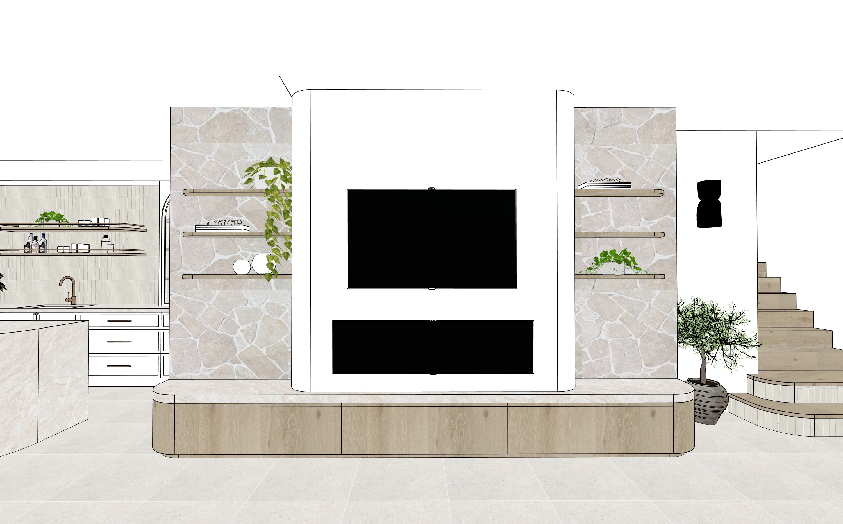 crazy stone wall have a rough surface taj mahal stone light oak timber tiled floor bottom two risers on stairs have this tile stacked https www tilesofezra com products ezr1550 thin dust bejmat wall sconce is this https www mcmhouse com products uno owan wall sconce and is a white plaster finish kitchen cabinetry is white
