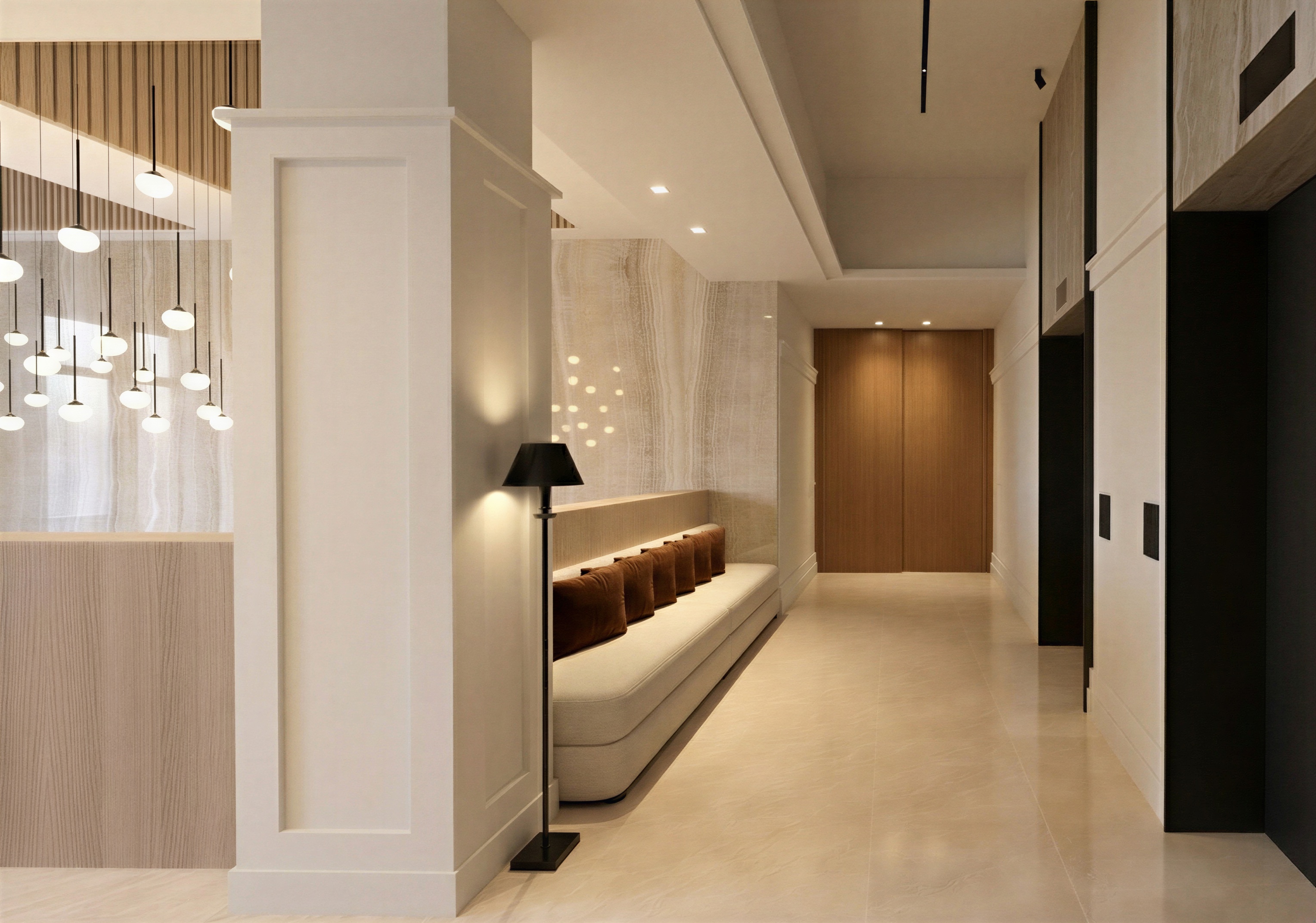 la parete in fondo al corridoio in legno rovere a listelli in rovere sbiancato