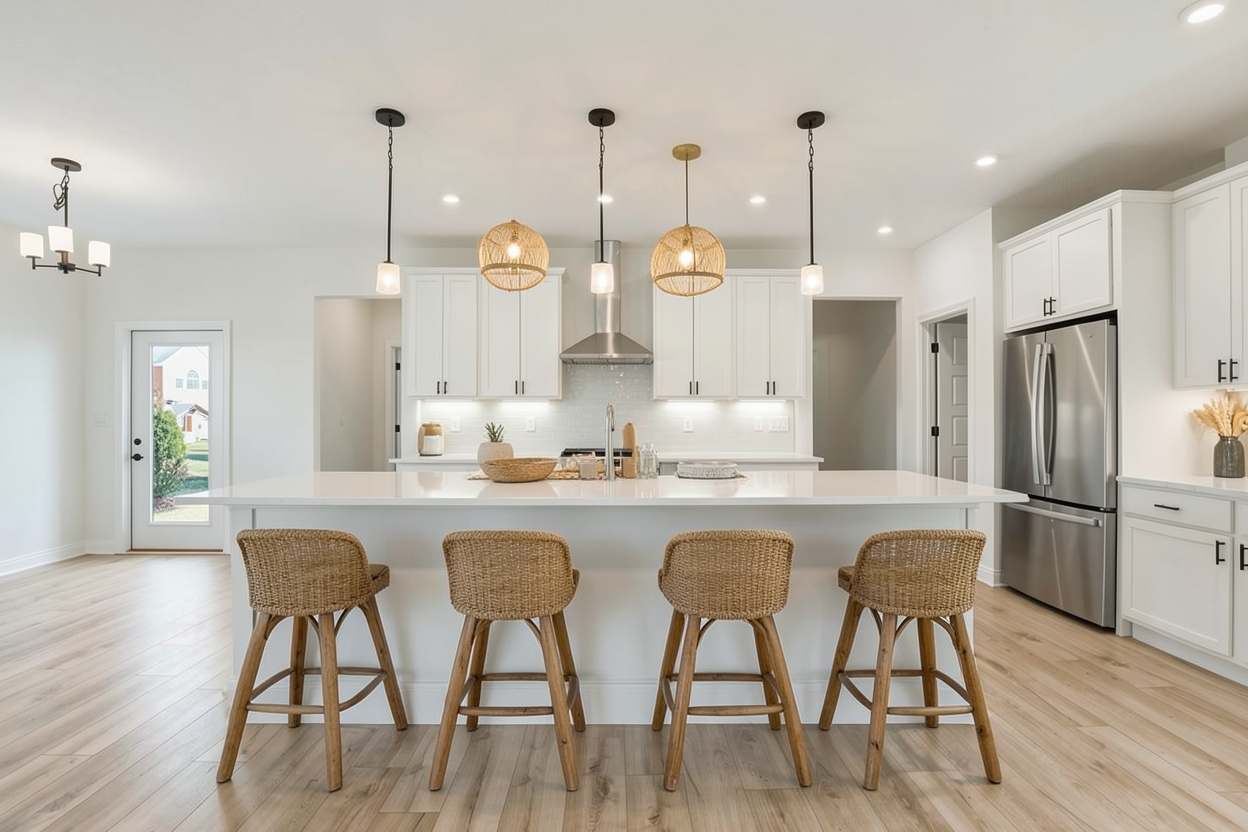 leave everything the same except remove the two boho pendants leave the black pendants add a dining table with 4 chairs under the left black chandelier include an area rug