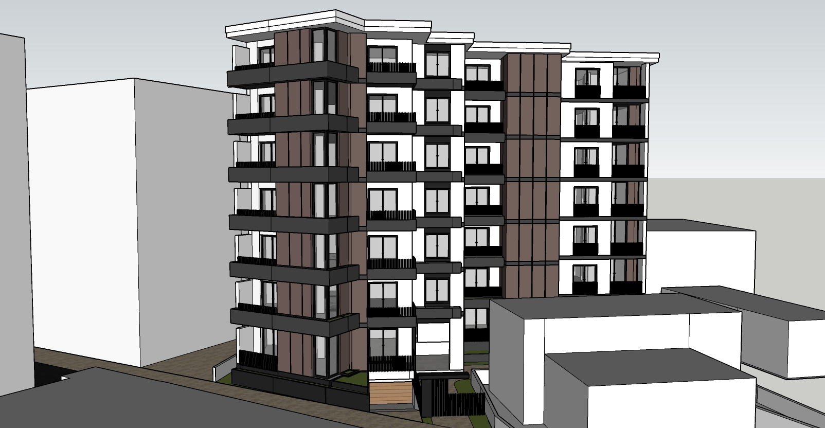 modern eco friendly apartment building facade large balconies vertical greenery natural light trees and soft shadows warm architectural render high detail photorealistic