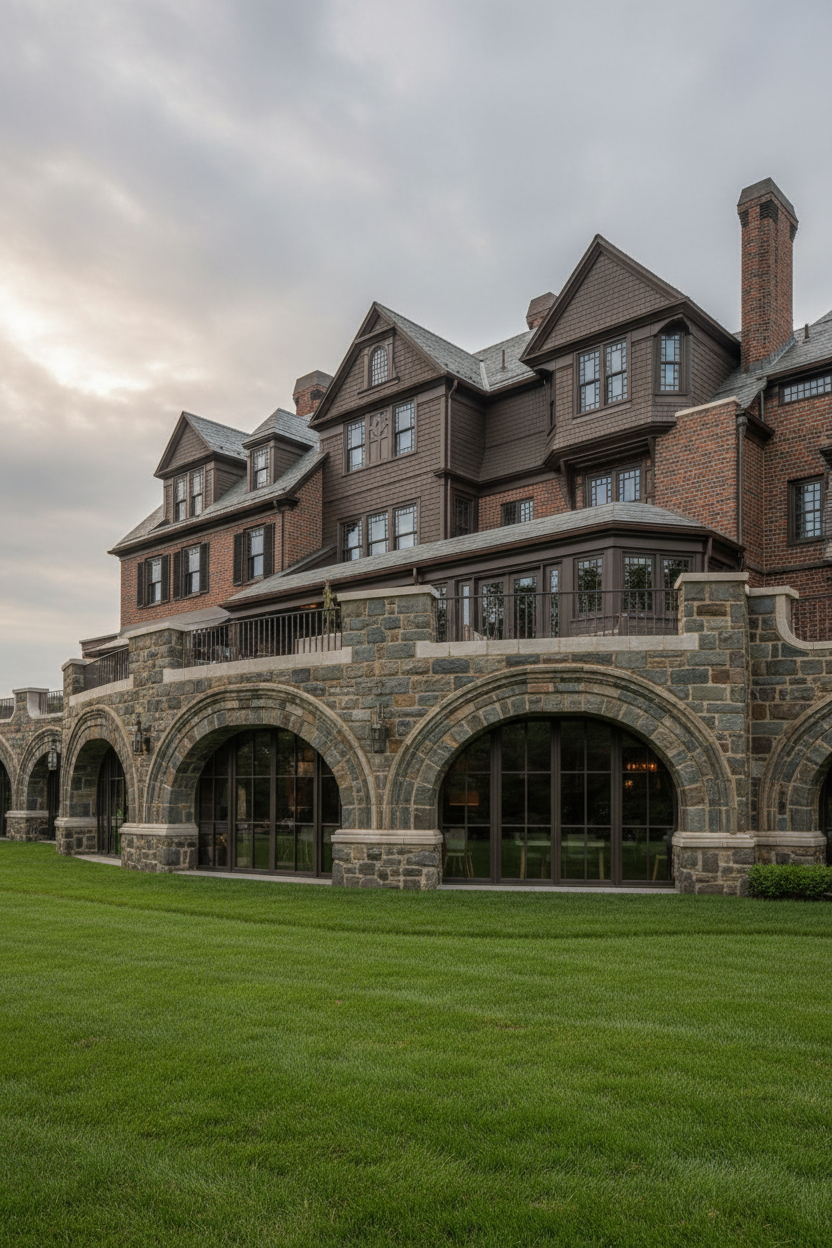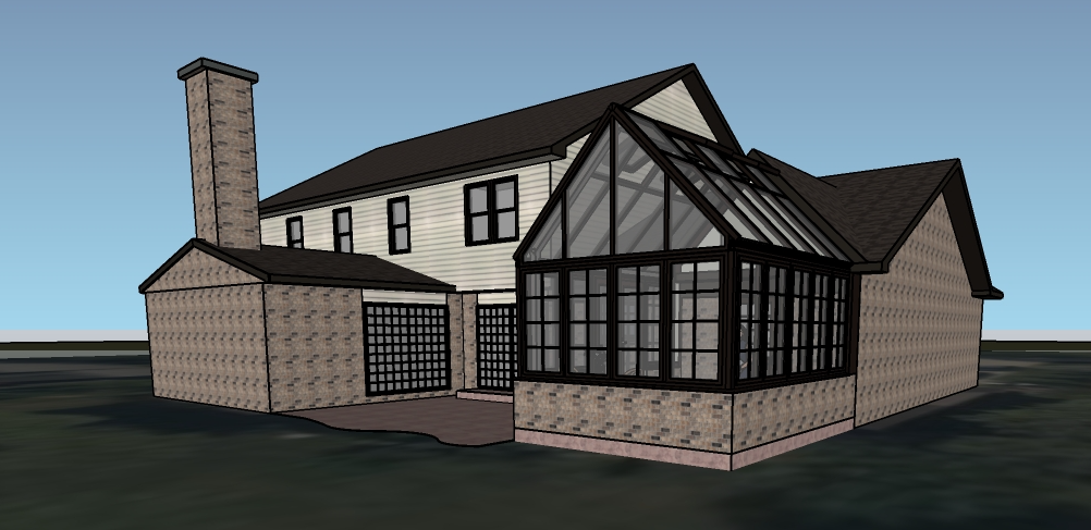 a beautiful serene architectural rendering of a luxurious brick house with a large glass greenhouse extension the brick walls are textured in shades of warm brown earthy beige and subtle gray the greenhouse features dark brown frames and clear glass reflecting the blue sky with fluffy white clouds the roofing of the house is a smooth elegant dark brown the manicured grass lawn is a vivid lush green casting soft shadows from the sun the atmosphere is calm and inviting showcasing a sunny day with a gentle breeze dyed concrete patio is full of potted plants and furniture garden beds surround greenhouse walls