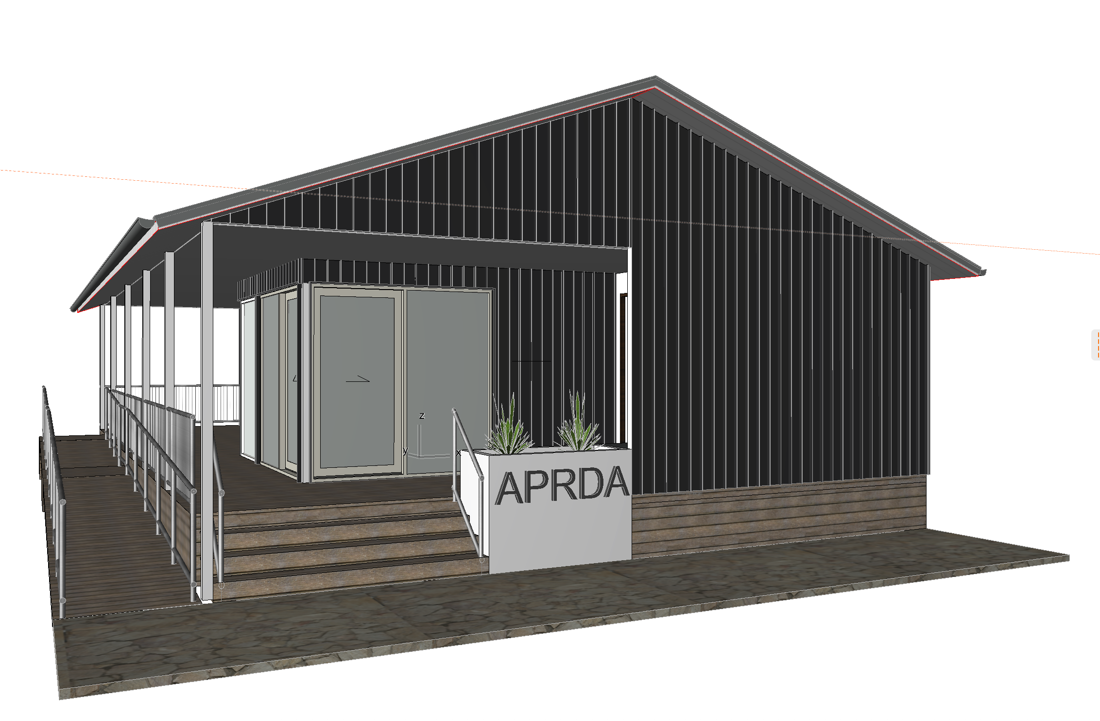 standalone modern building in dense bushland vertical cladding minimalist geometric forms sharp lines high contrast lighting dramatic shadows abstract integration with nature cinematic perspective striking composition include someone in a wheelchair