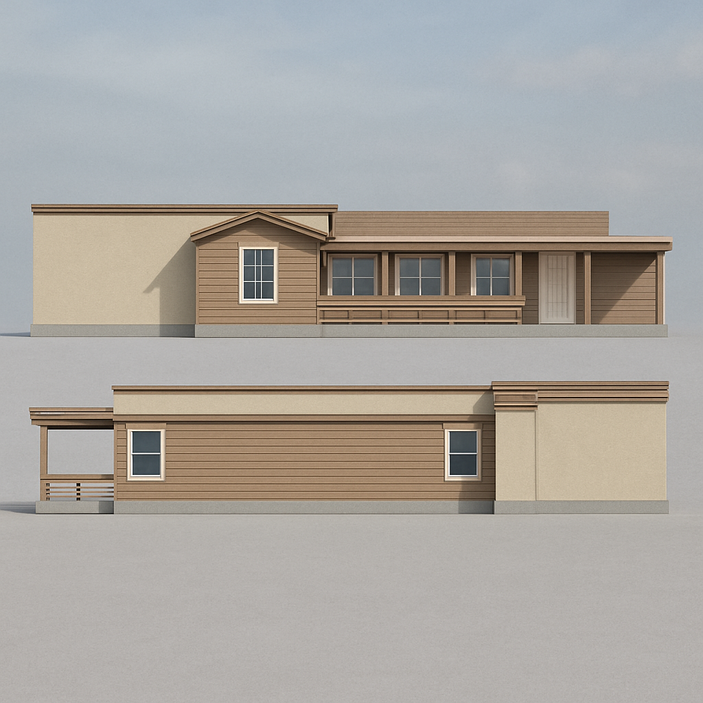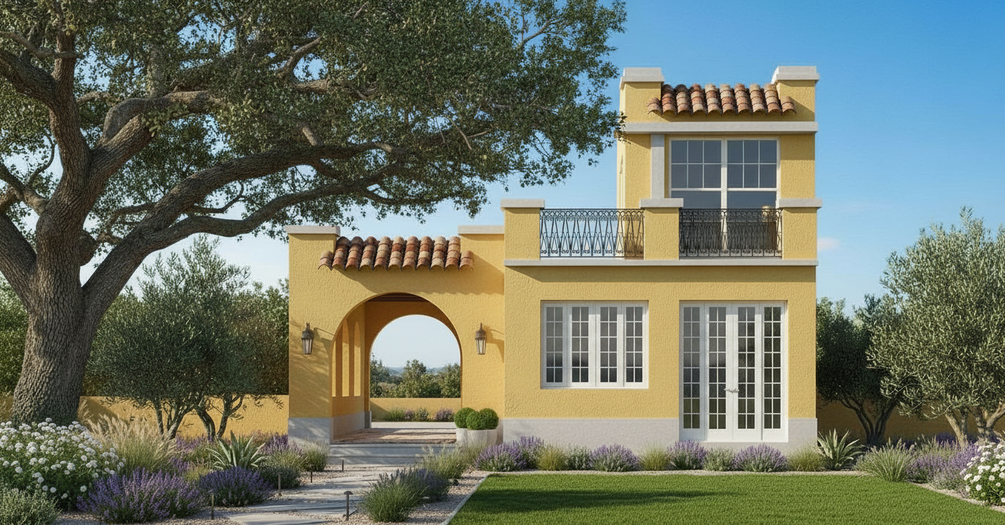 keep all geometry and building details the same but make the lighting colors and tree shadow like the reference image