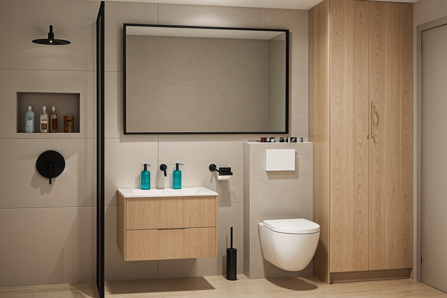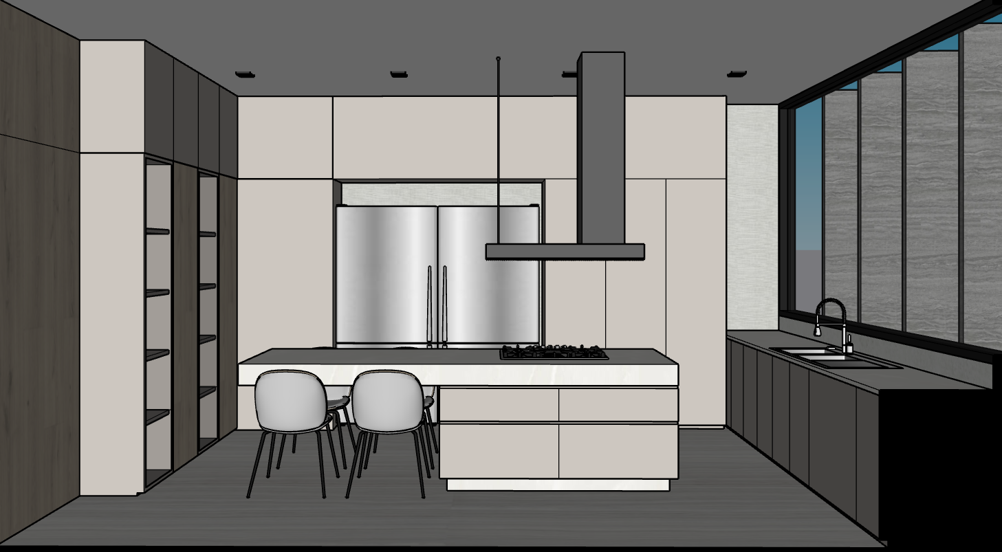 render a modern minimalist kitchen with an elegant and sleek design the cabinets and floor are ligth taupe exuding sophistication the walls are a soft beige providing a warm and inviting backdrop include a stainless steel refrigerator and island with white marble countertops for a luxurious touch the chairs are white with black legs adding contrast the windows are large featuring a view of a clear blue sky ambient lighting is soft and natural enhancing the serene and contemporary atmosphere