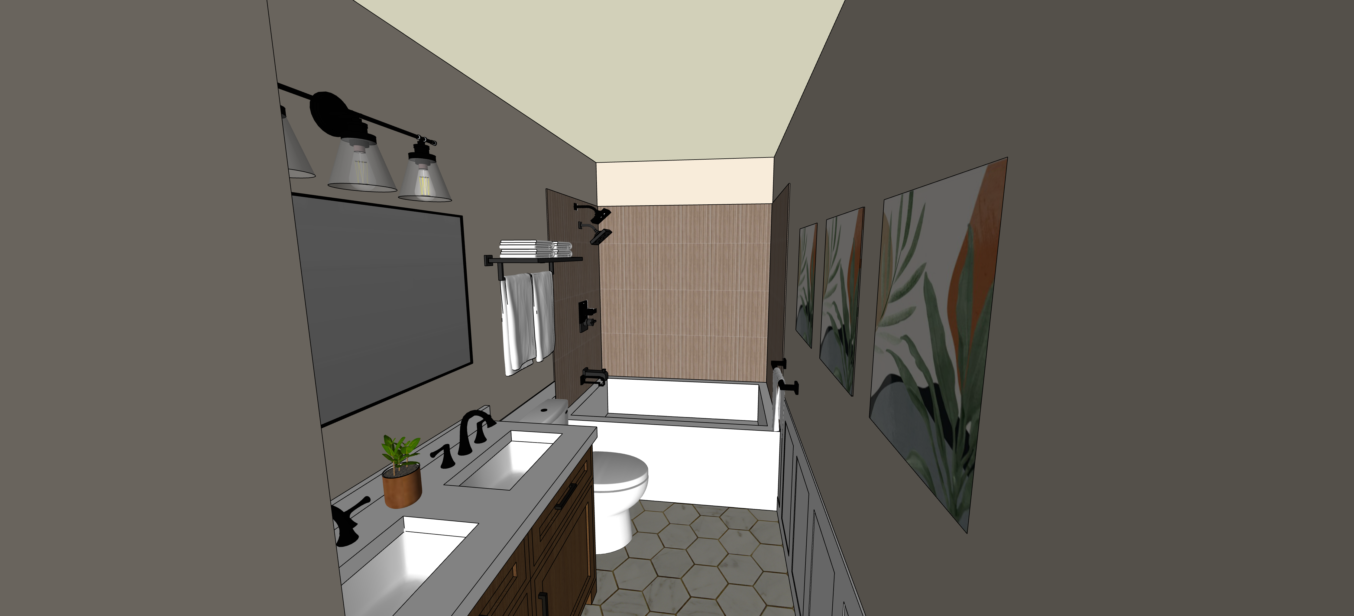 create a photorealistic rendering of my 3d sketchup model of this bathroom add a ceiling with recessed lighting