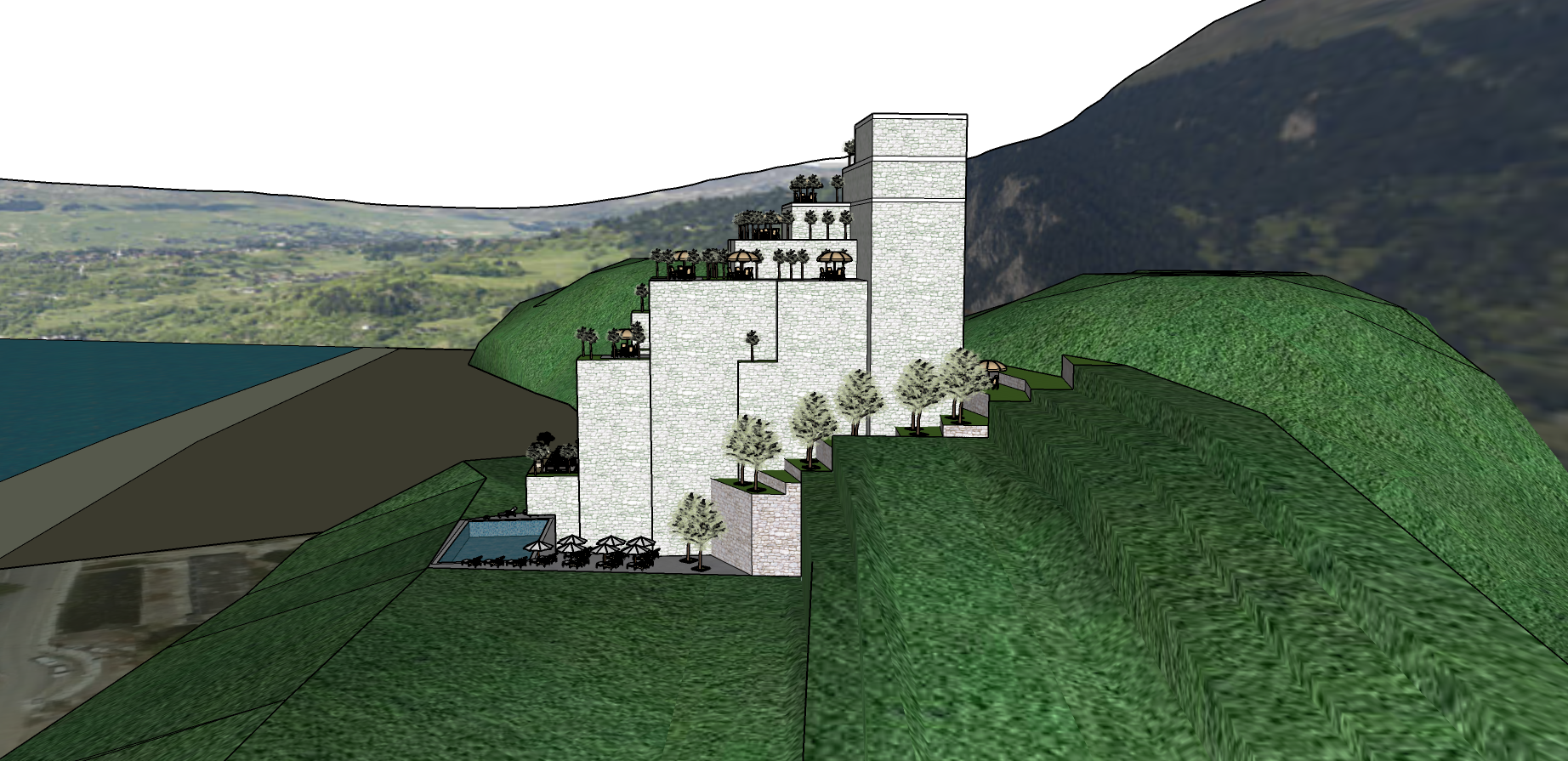 render a stunning architectural resort nestled in lush green mountains featuring cascading terraces with light grey stone walls put large tall and wide glass doors overlooking the terraces and also many windows in all the walls windows and doors have to prevail over the facade each terrace is adorned with vibrant green lawns and elegant parasols in soft beige the surrounding trees are a mix of muted silver and deep green foliage incorporate a luxurious inviting pool at the base with clear blue water the atmosphere exudes tranquility and harmony with nature with soft natural lighting emphasizing the serene setting please fill the surrounding hills with olive trees and some houses make it an elite residential zone render a stunning architectural resort nestled in lush green mountains featuring cascading terraces with light grey stone walls put large tall and wide glass doors overlooking the terraces and also many windows in all the walls windows and doors have to prevail over the facade each terrace is adorned with vibrant green lawns and elegant parasols in soft beige the surrounding trees are a mix of muted silver and deep green foliage incorporate a luxurious inviting pool at the base with clear blue water attention the pool is small and it is on the left of the buildings base the atmosphere exudes tranquility and harmony with nature with soft natural lighting emphasizing the serene setting please fill the surrounding hills with olive trees and some houses make it an elite residential zone notice the sea on the left of the picture