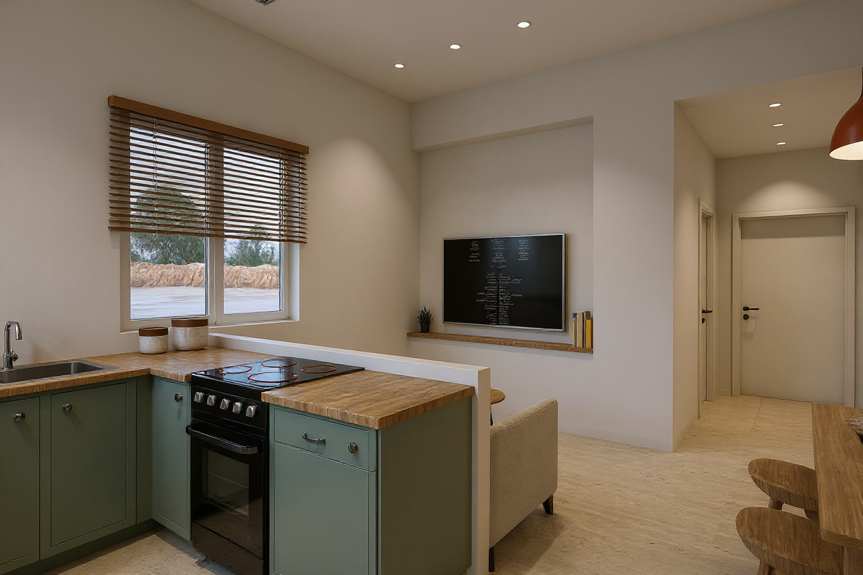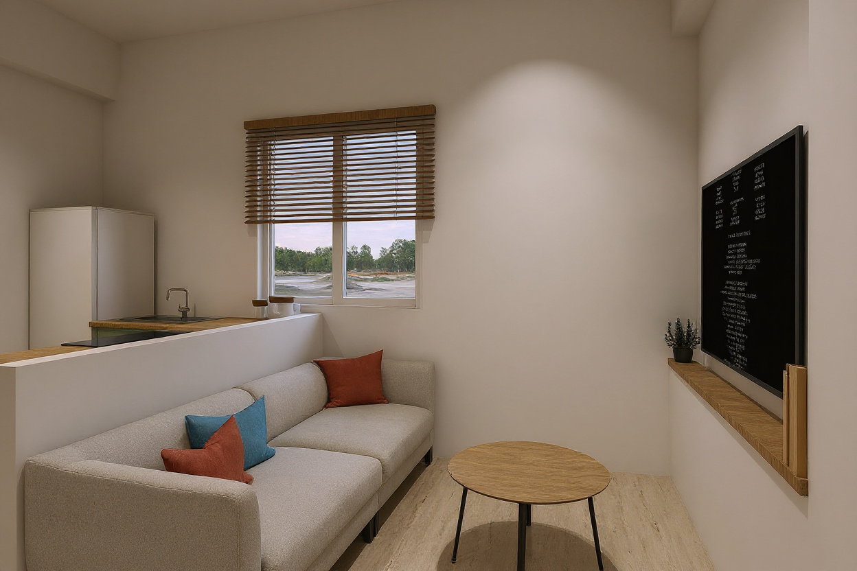 change geometric wall to acoustic panels of triangular shapes of light blue white grey change seating around the white tables to a modern fabric seating alternating colours of subtle blue whtie and grey make the carpet a laminate wood texture vinyl add modern lighting in the area this is a kitchen breakout area for staff make the floor of light oak texture