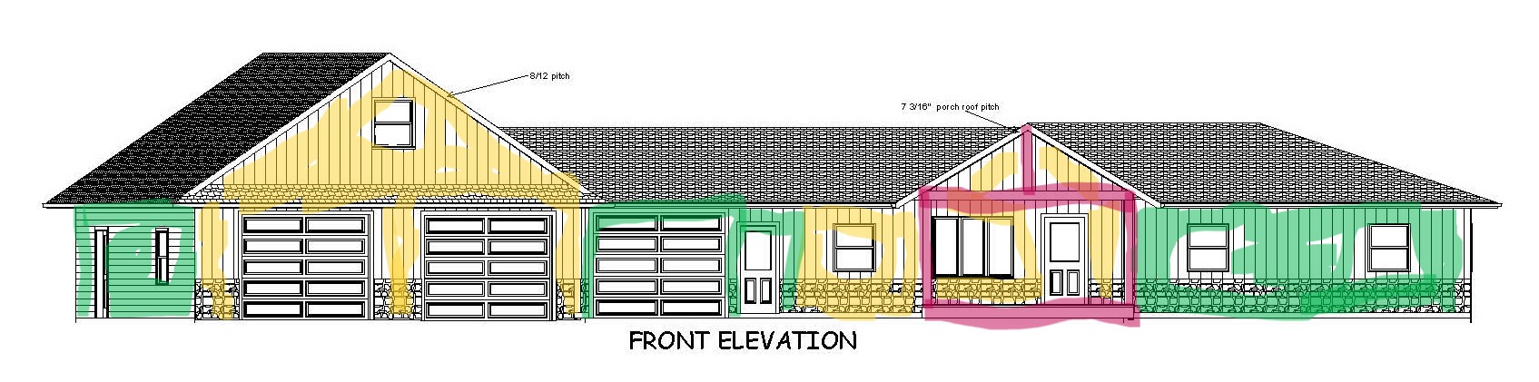 where there is yellow make that a limestone finish where there is green make that a dark forest green vertical siding where there is pink make that a medium wood finish