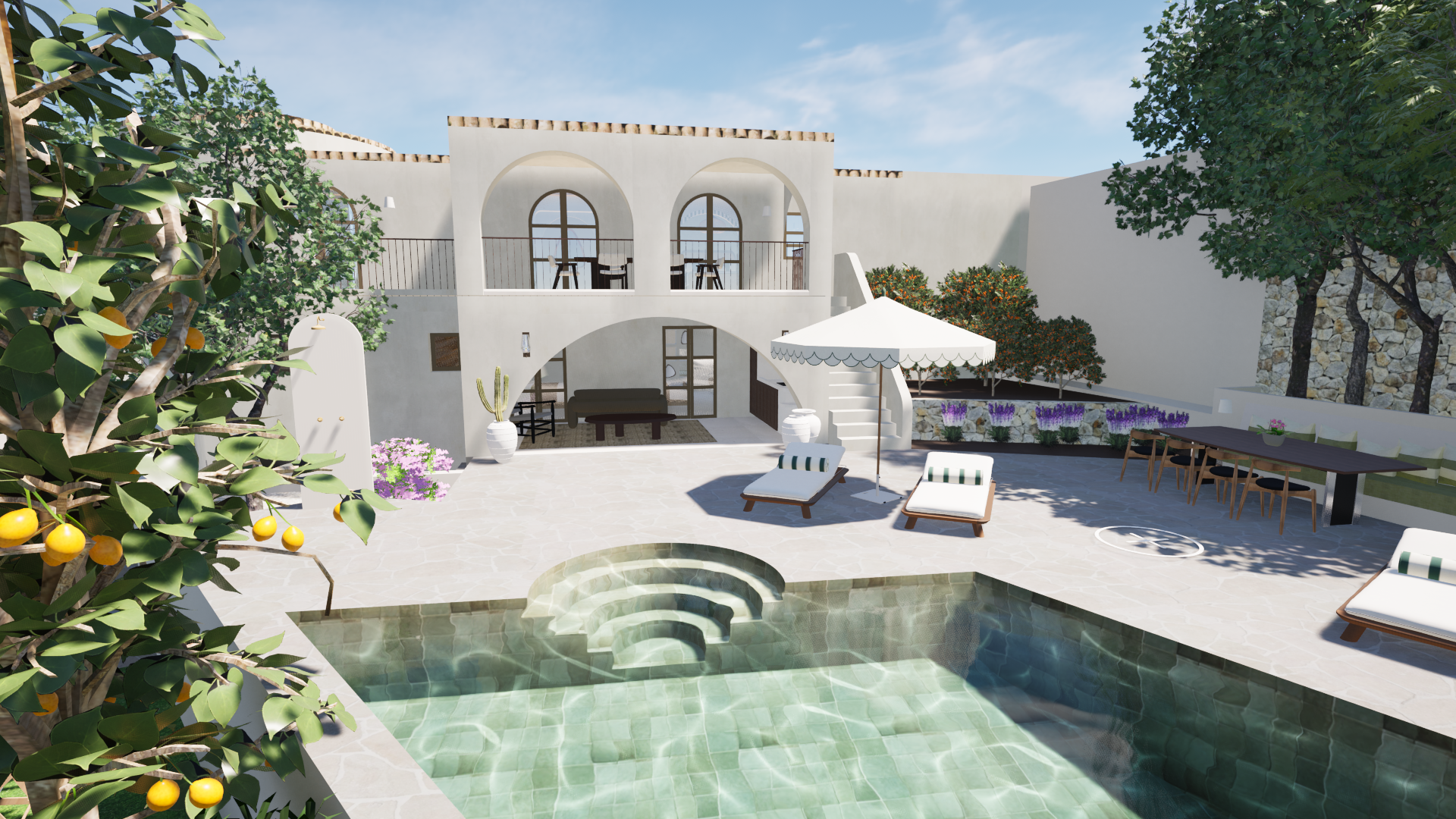 make realistic render from this house in el portet moraira lush garden with lots of green purple pink and white flowers in mediterrenean style surrounded by mediterenean atmosphere