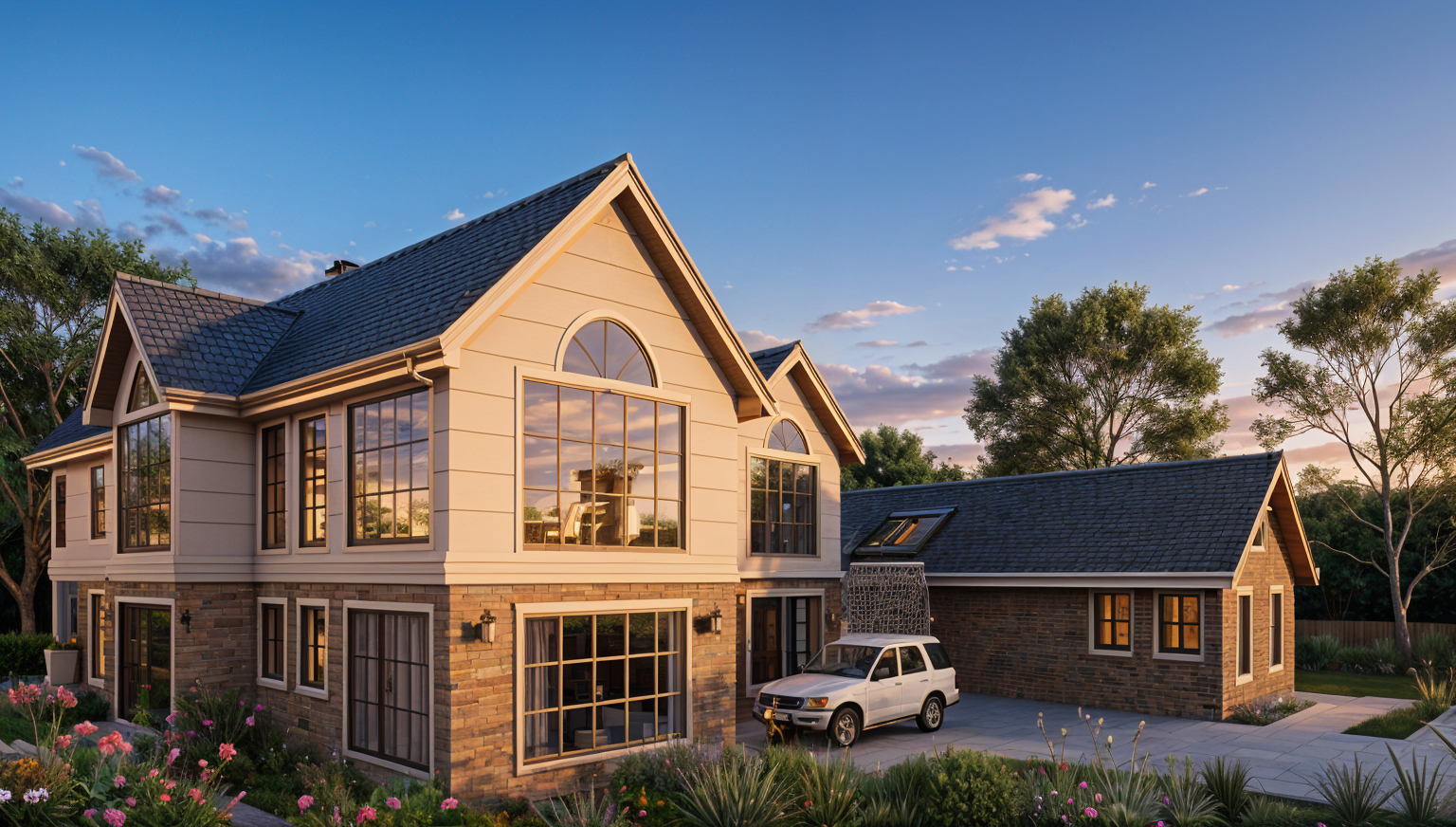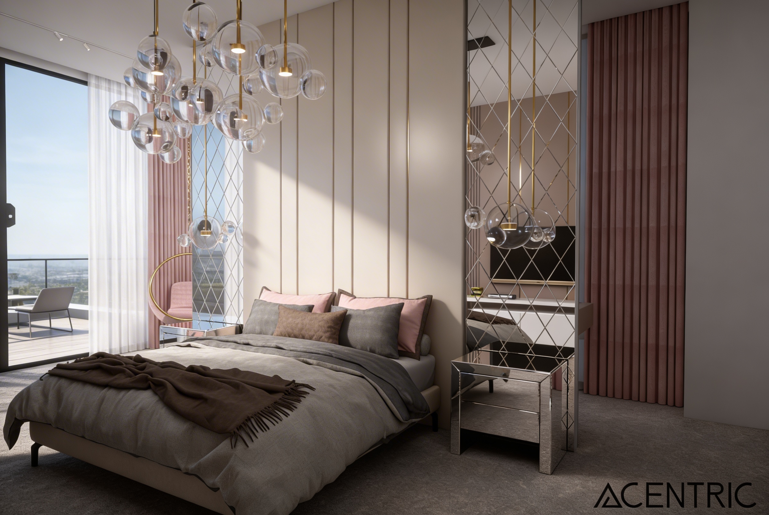 create a hyper realistic rendering with soft morning light through the doors interior shot of modern bedroom with doors opening up to yard with seating area and greenery the flat is in athens greece modern abstract artwork above bed colourful throw on bed modern linear pendants above nightstands hidden led lights on the ceiling all lights off tone should be relaxing and inviting