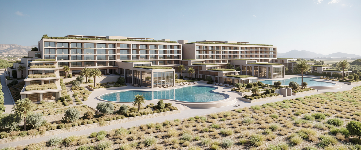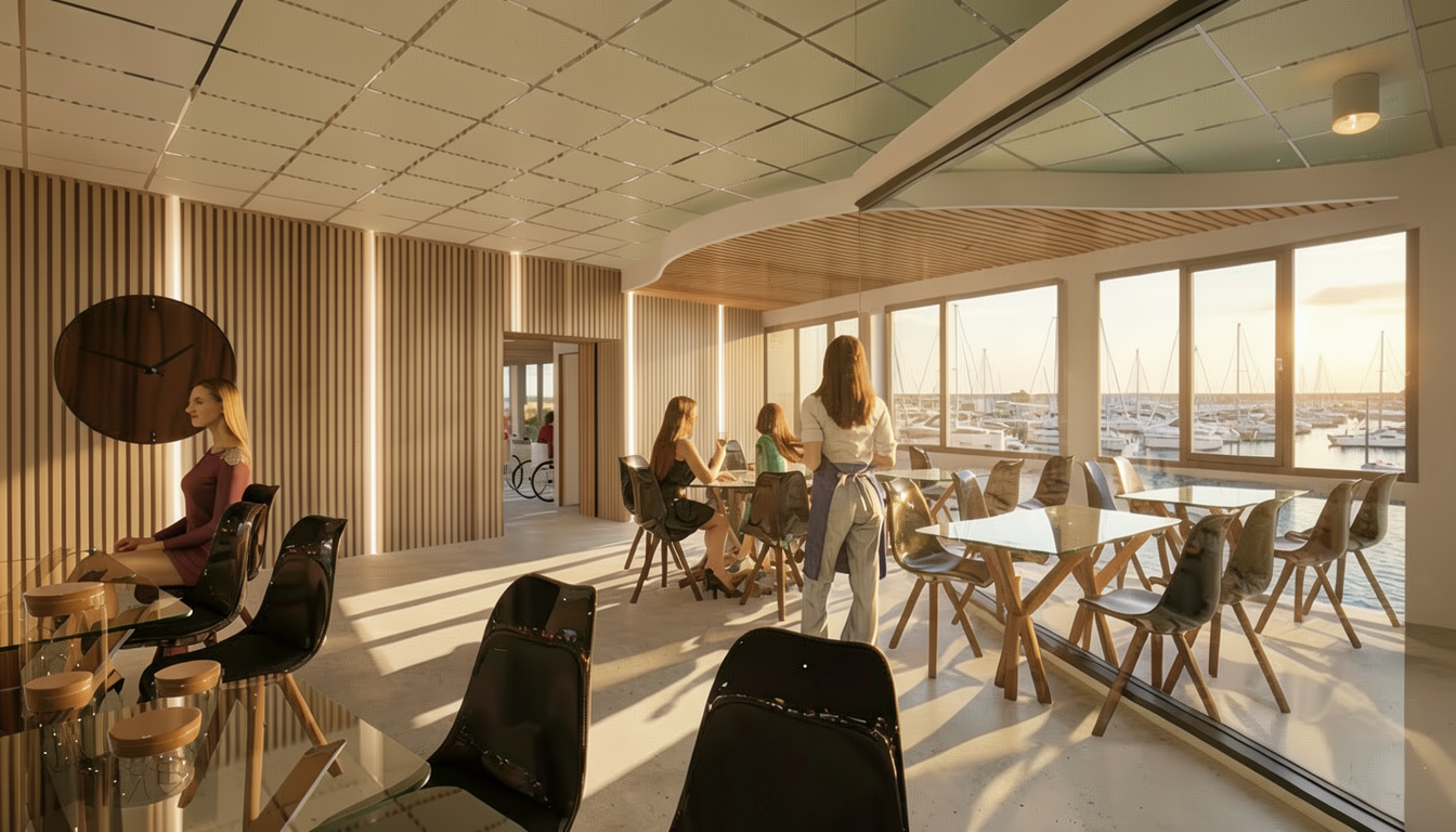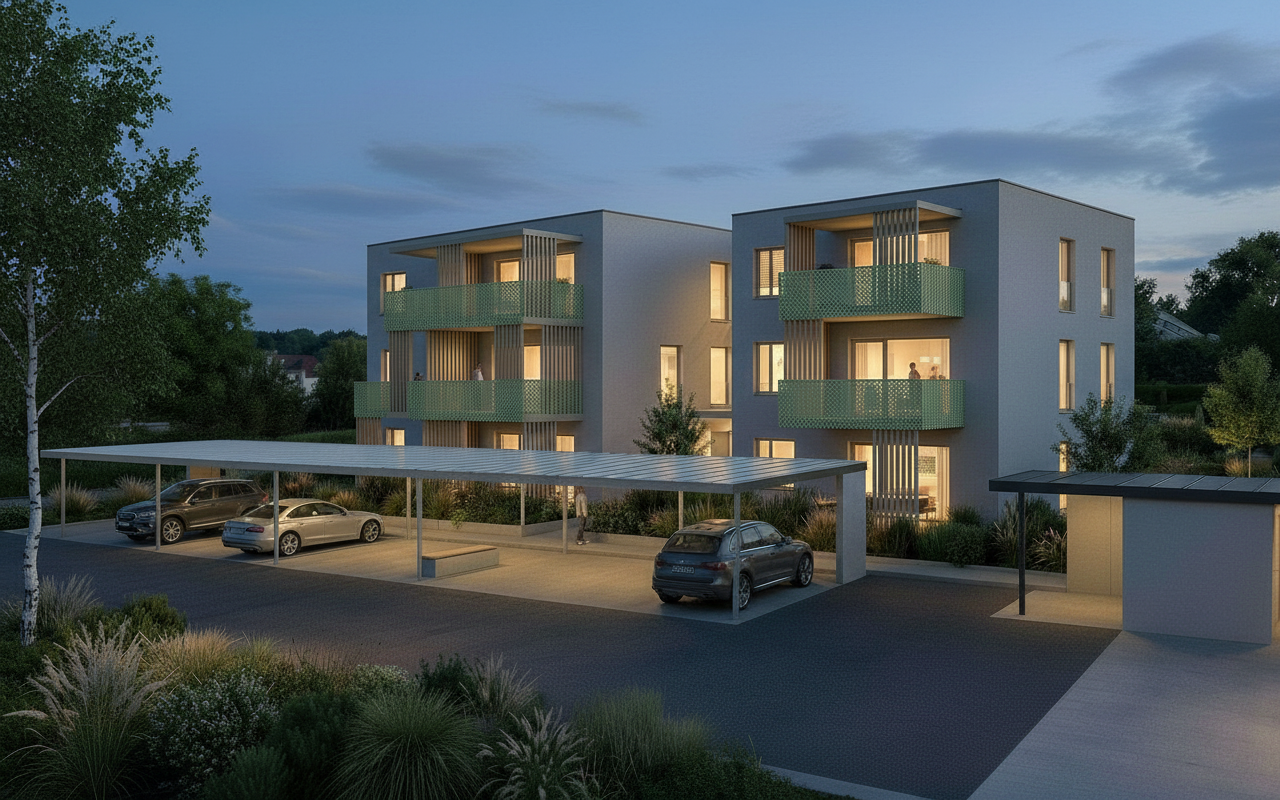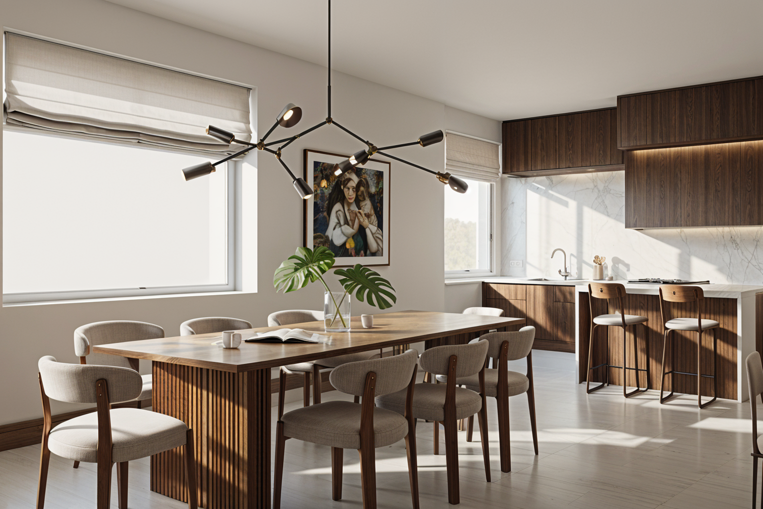 transform this image into a hyper photorealistic architectural visualization replace all non realistic materials with lifelike versions maintaining the dominant color palette add natural subtle sheen glossy highlights on metals and glass realistic textures on wood concrete and plaster change background to serene lake region surrounded by dense forest enhance surrounding environment to ultra realistic quality while preserving exact structure and shape of bushes trees grass and lake detailed tree bark with moss realistic leafy shrubs with natural density variation short grass blades with soil patches reflective lake surface with gentle ripples and realistic water depth show vertical curtains visible through all windows subtly billowing add precise environmental reflections in every glass pane bright high key lighting throughout with even daylight illumination no harsh shadows clear blue sky with soft clouds ultra detailed 8k photorealistic render professional architectural photography style