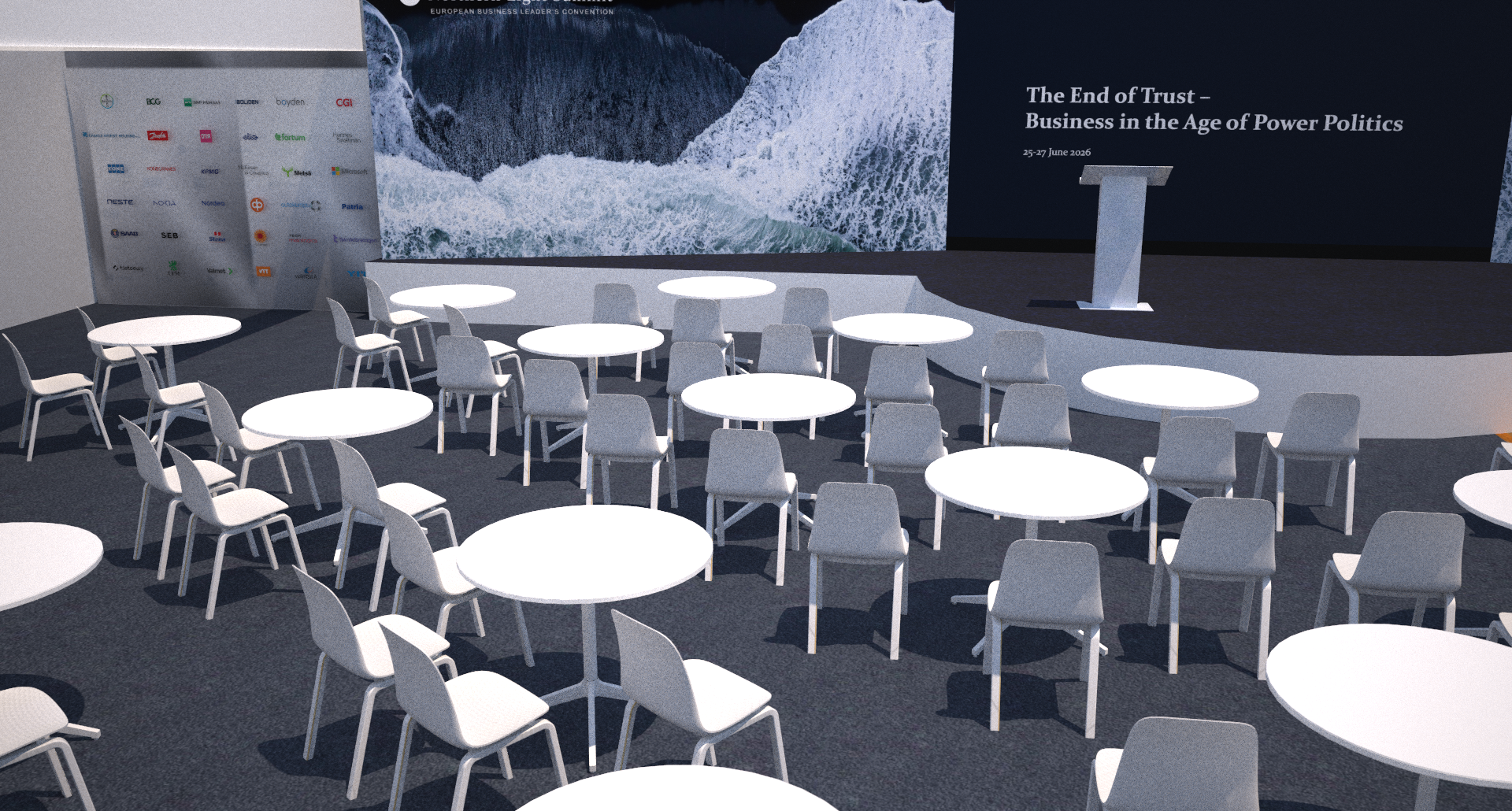 while maintaining the colors this seminar room should have the lectern chrome mirror covering also the wall on the left side should look like the logos are taped on big mirror wall
